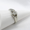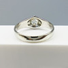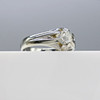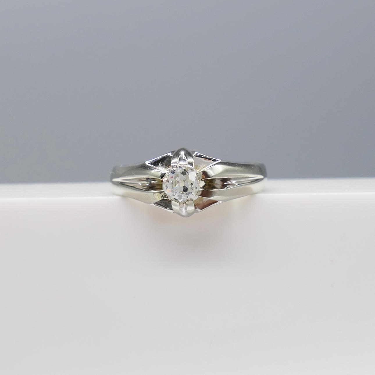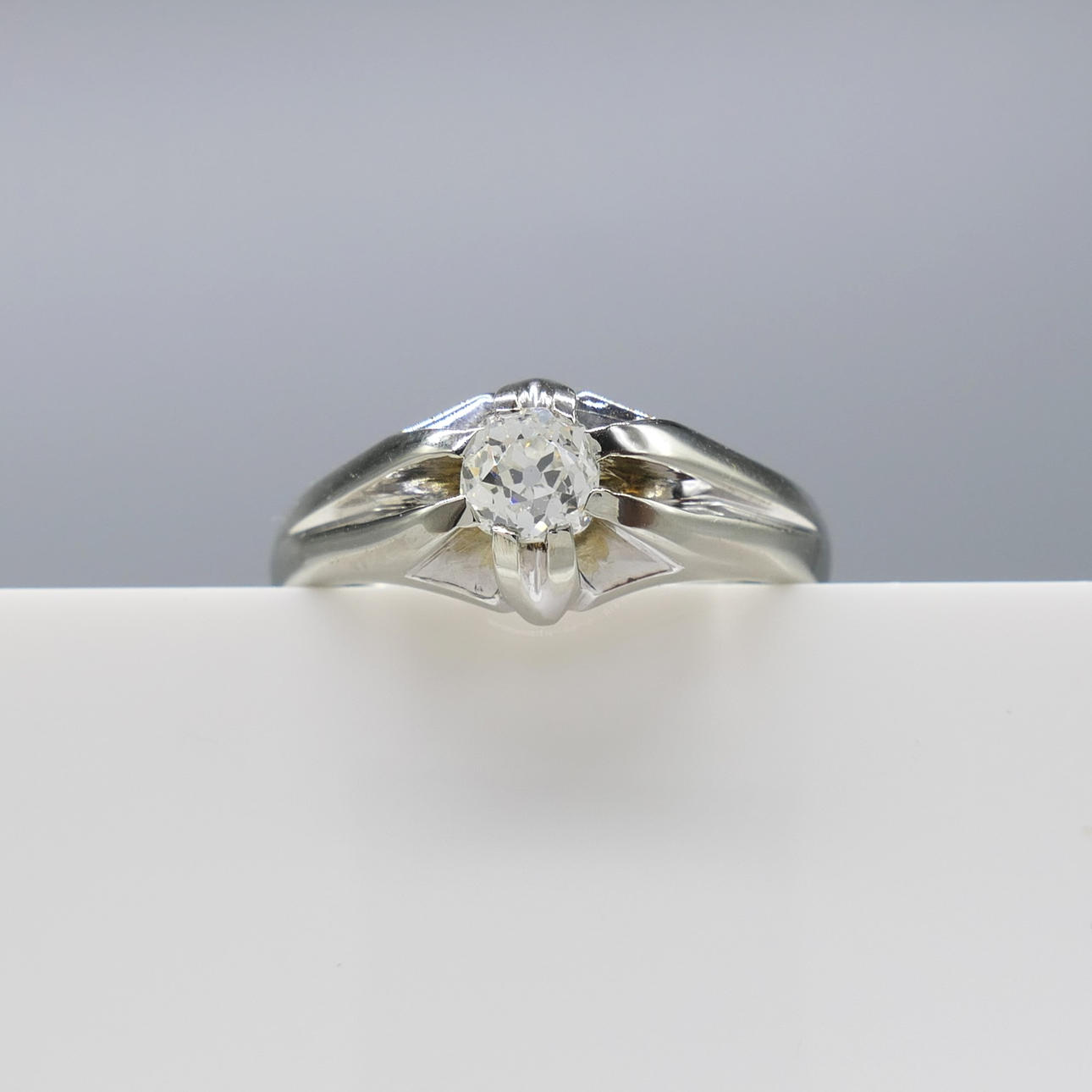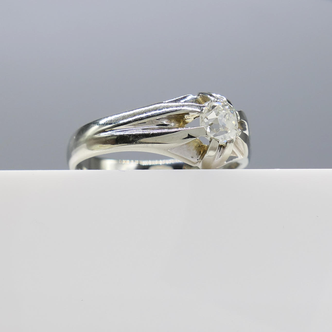 Ring: 18k white gold as tested and stamped 750; 8 claw gypsy-style setting; weight 5.6 grams