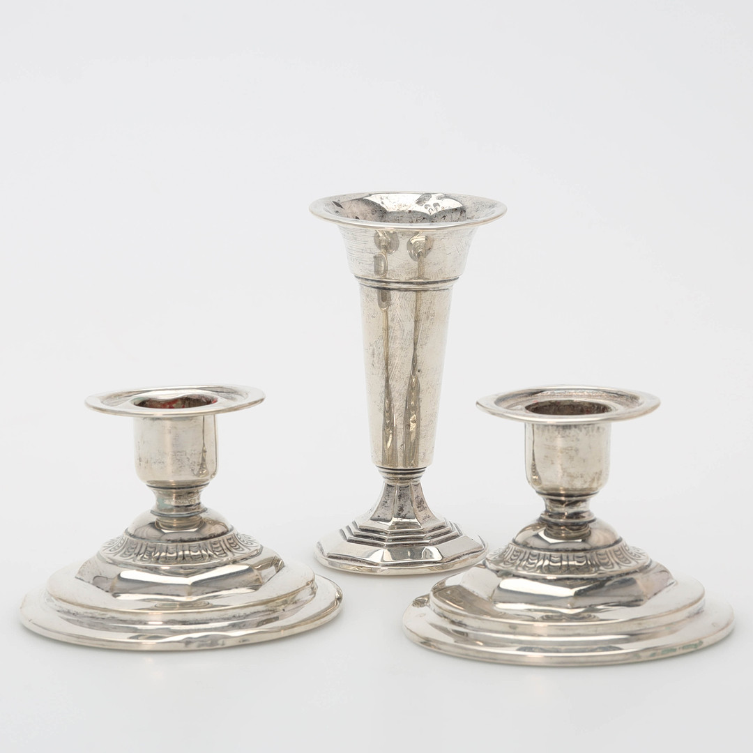 4993530. CANDLESTICKS and vase, 3 pieces, silver.