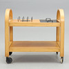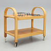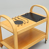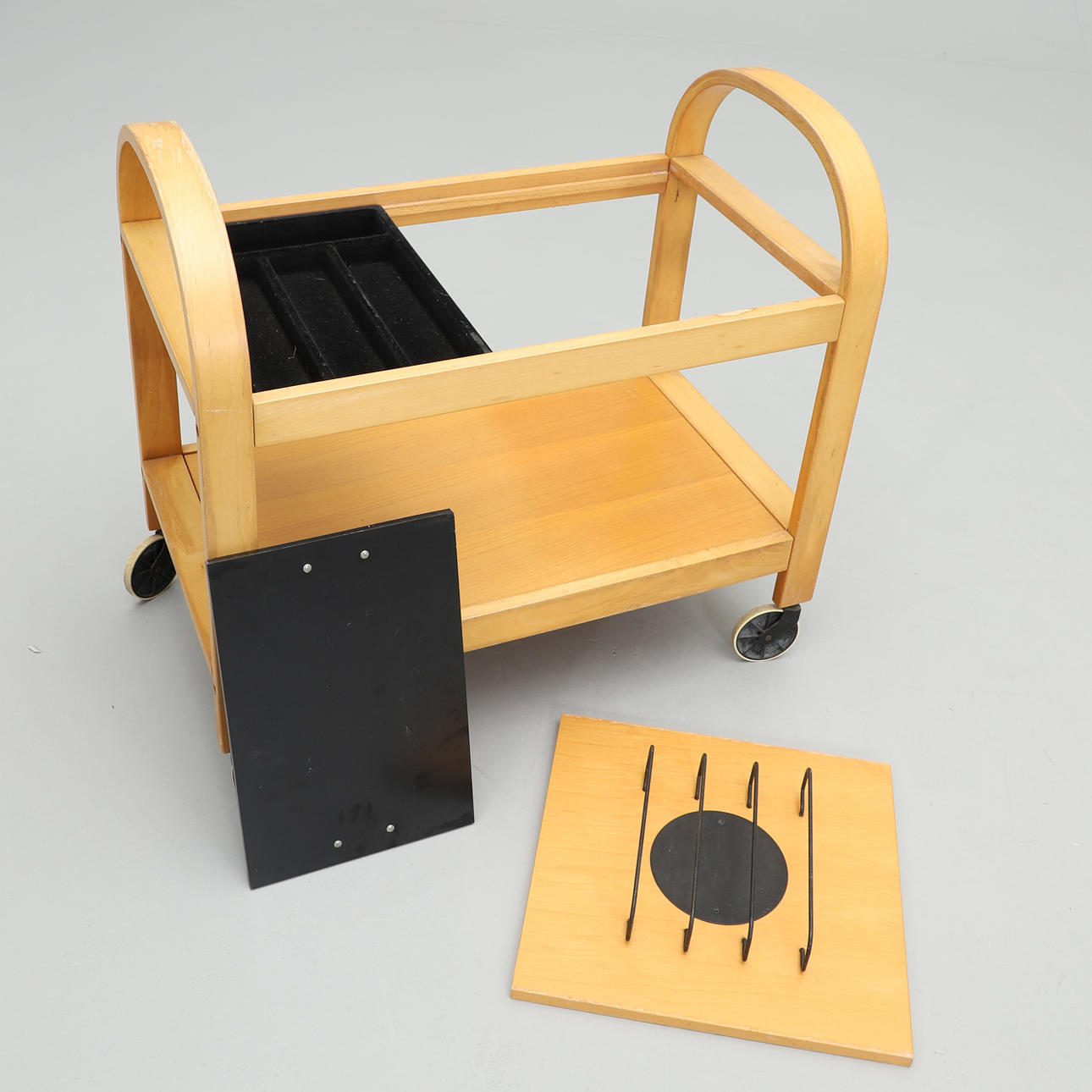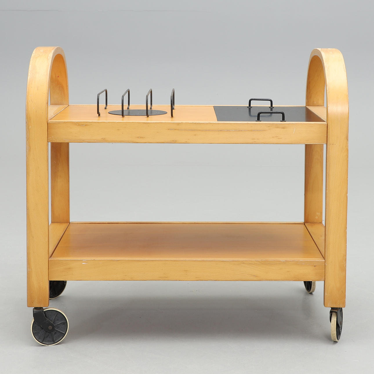 Beech and black metal. Black cover with underlying cutlery drawer. Length 81, width 45, height 75 cm.