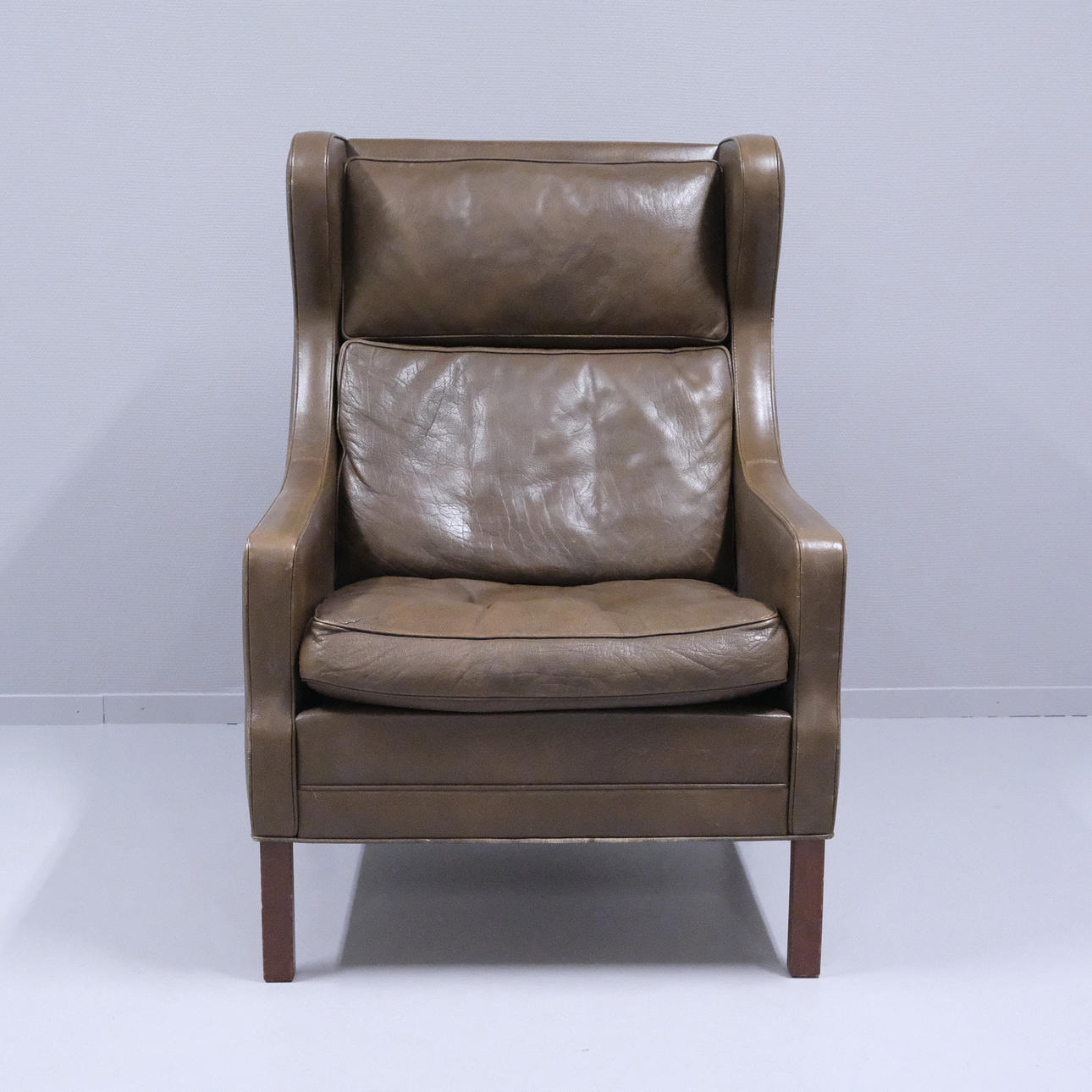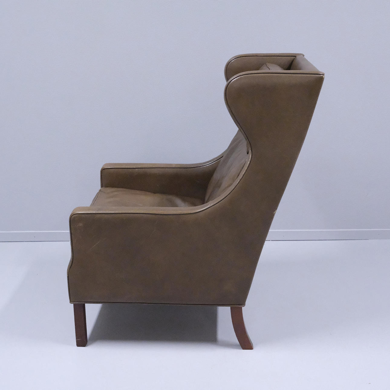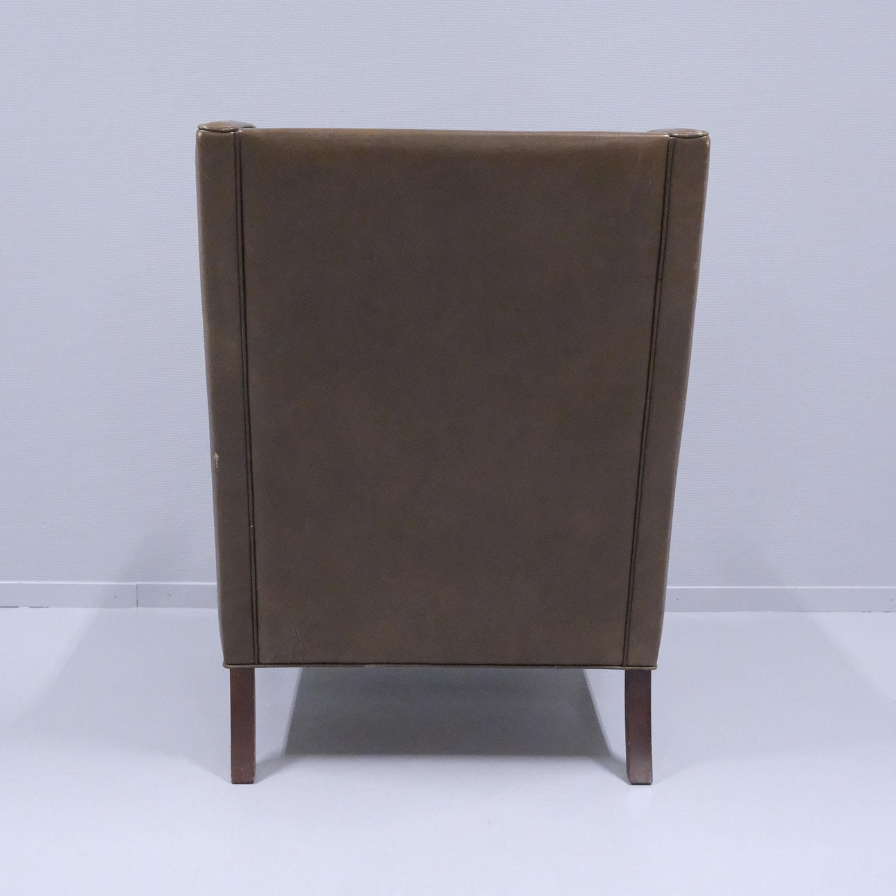 High-backed armchair, loose cushions, unmarked. Height 106cm, seat height 49cm. Width 72cm. Depth approx. 93cm.