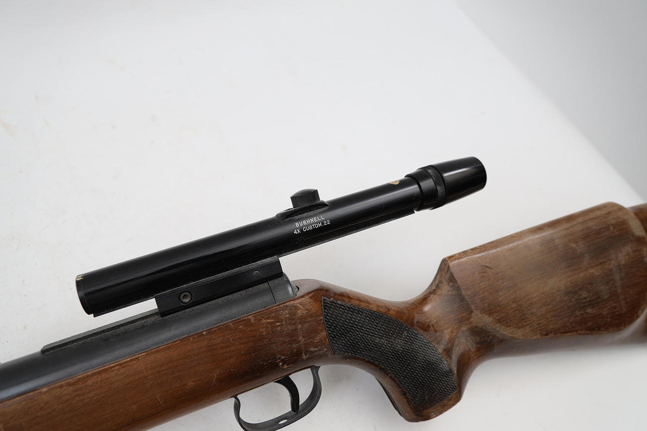 Stained net cut wooden flask. Binoculars Bushnell 4 x 32mm.