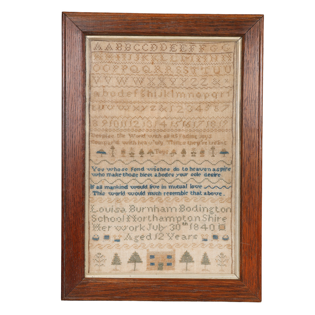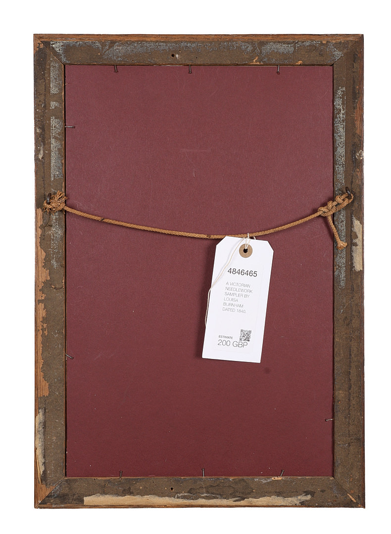 4994007. A VICTORIAN NEEDLEWORK SAMPLER BY LOUISA BURNHAM DATED 1840.
