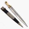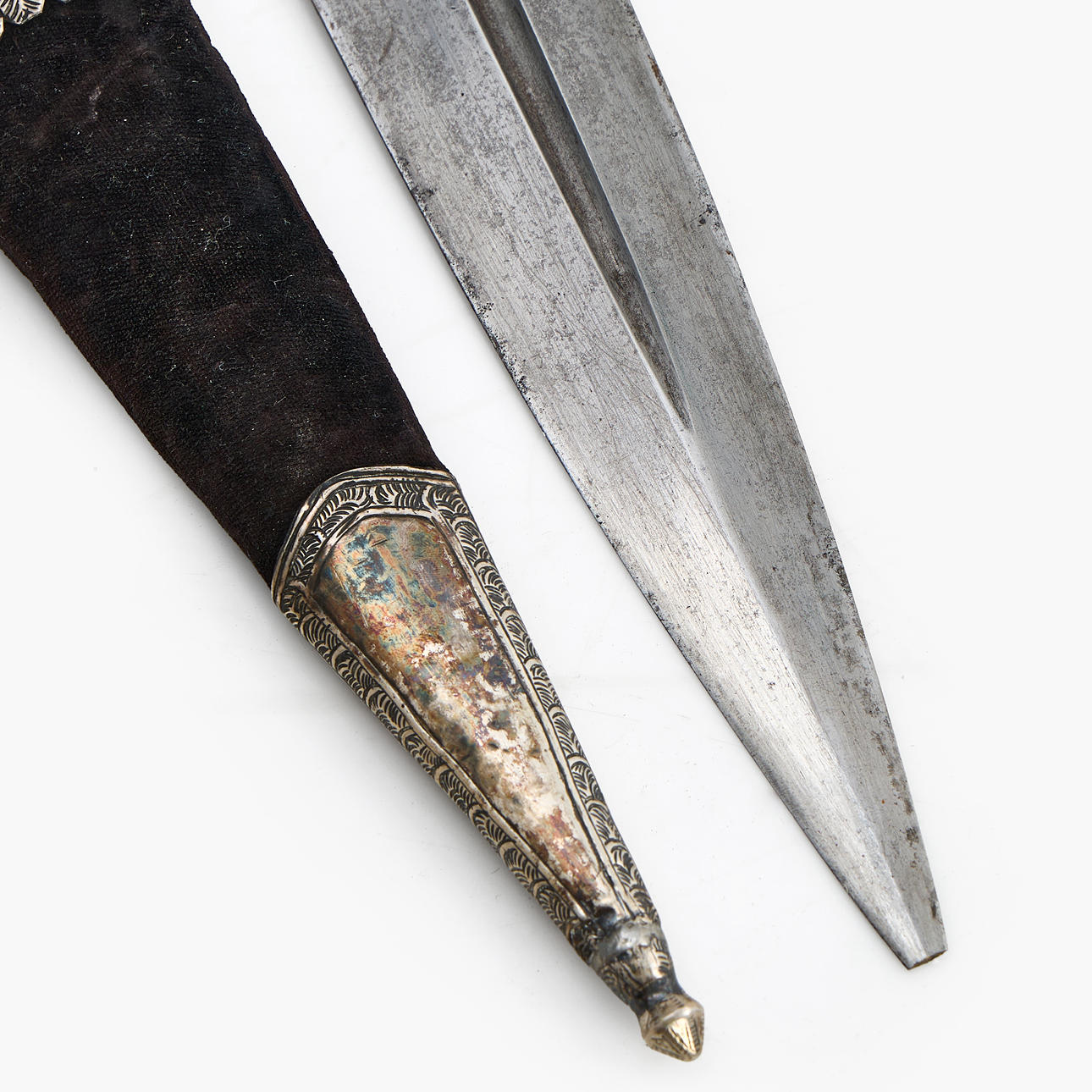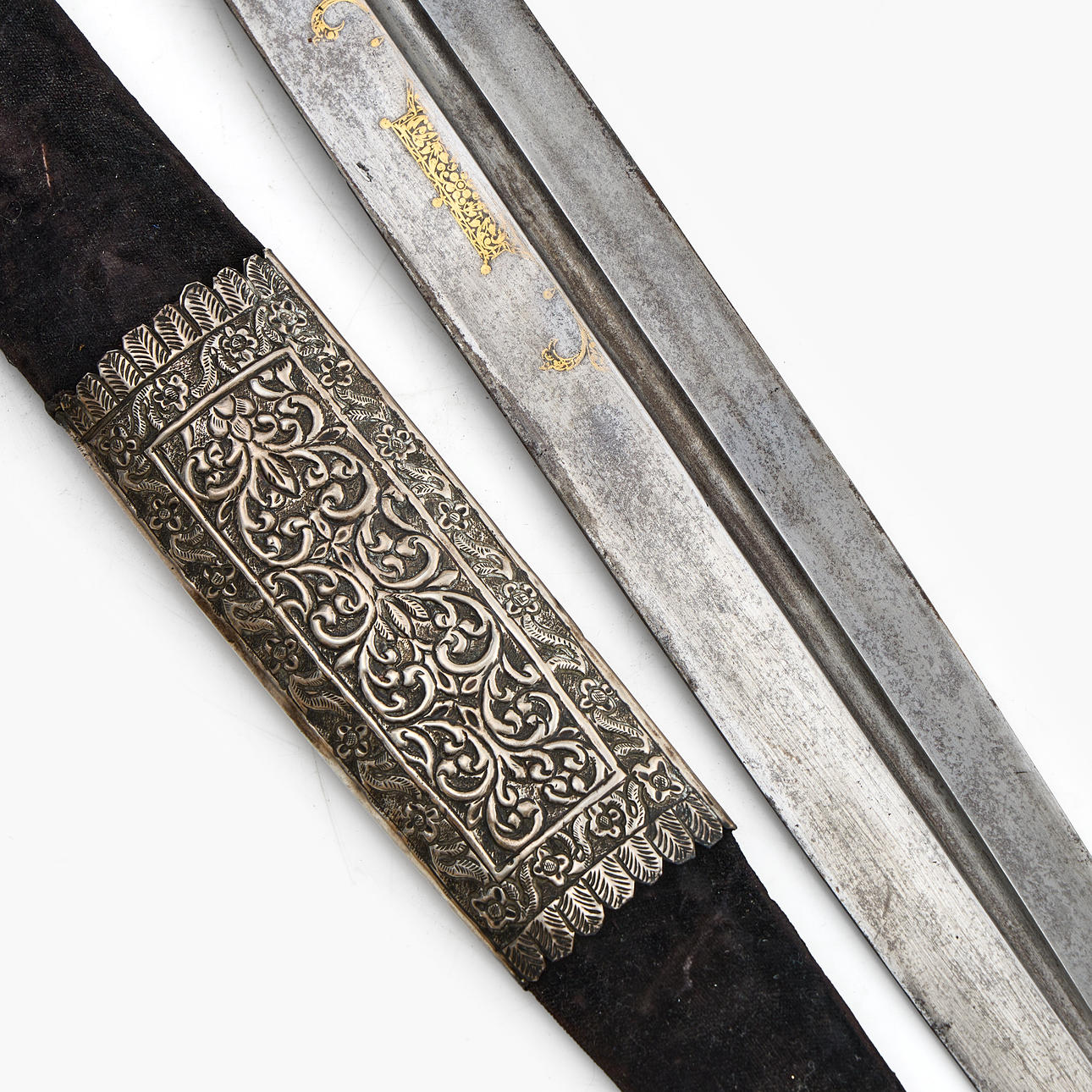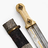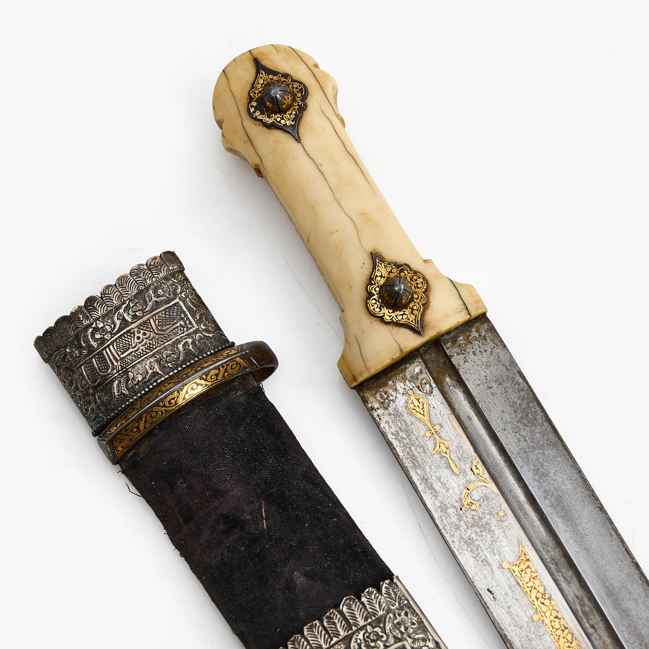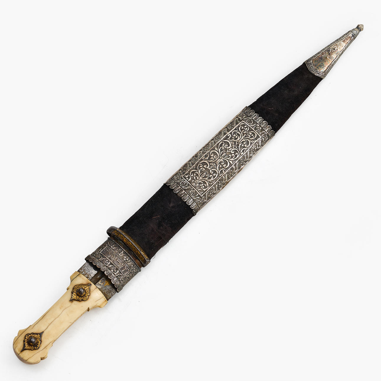 Rolling pin in bone, rolling pin with gold inlays. Textile tub with white metal fittings. Blade length 44xm, total 57cm.