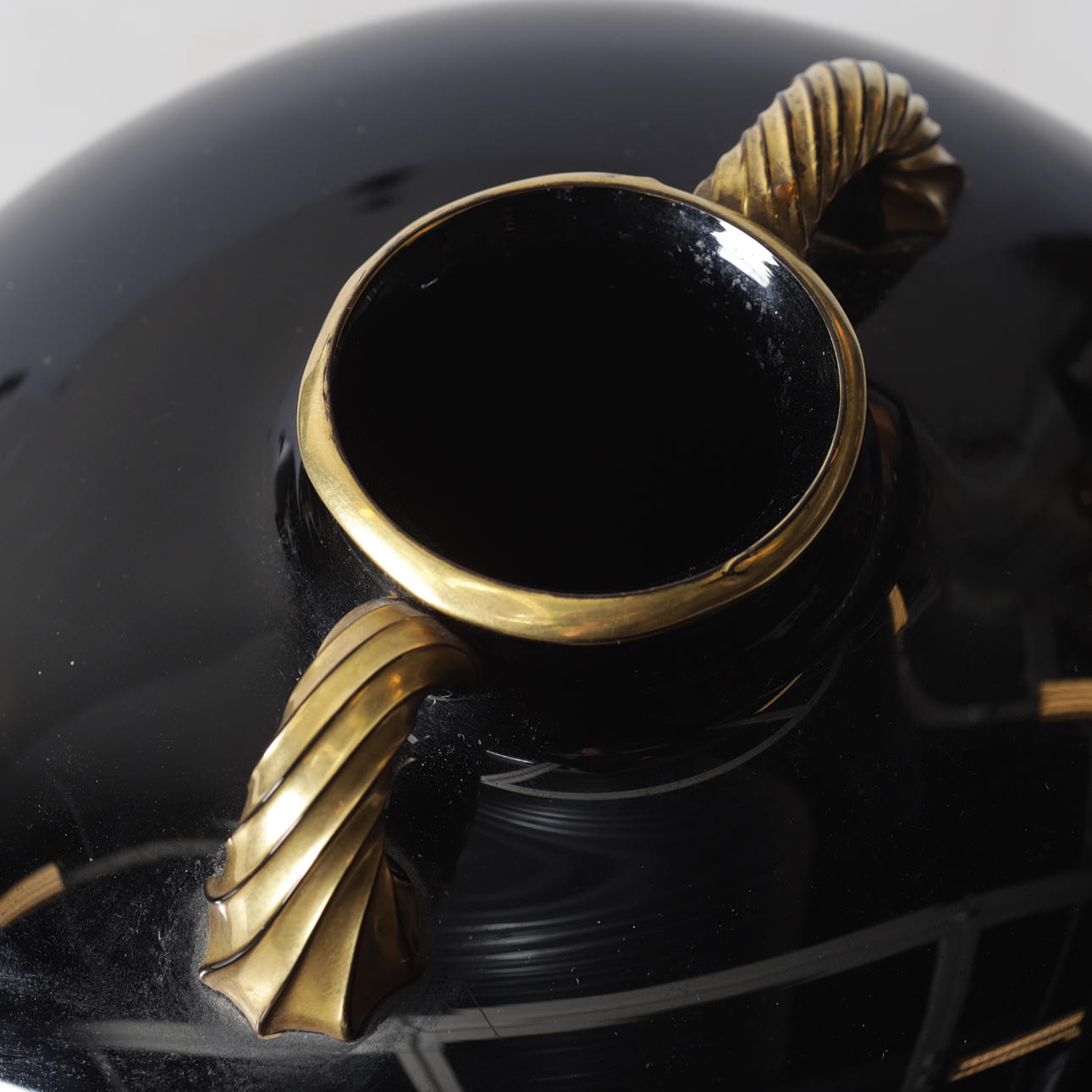Vase in black glass mass, with gold-colored decor