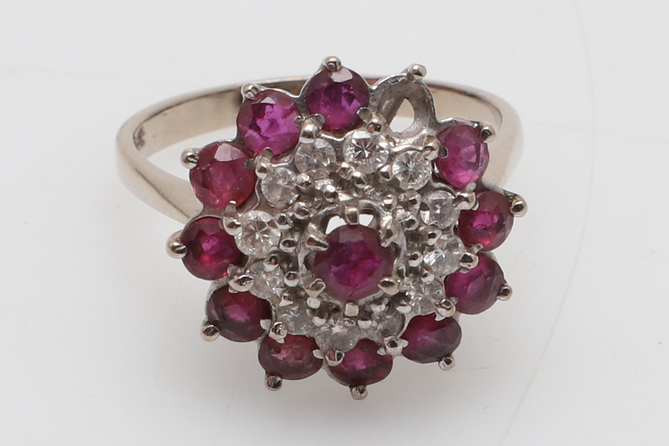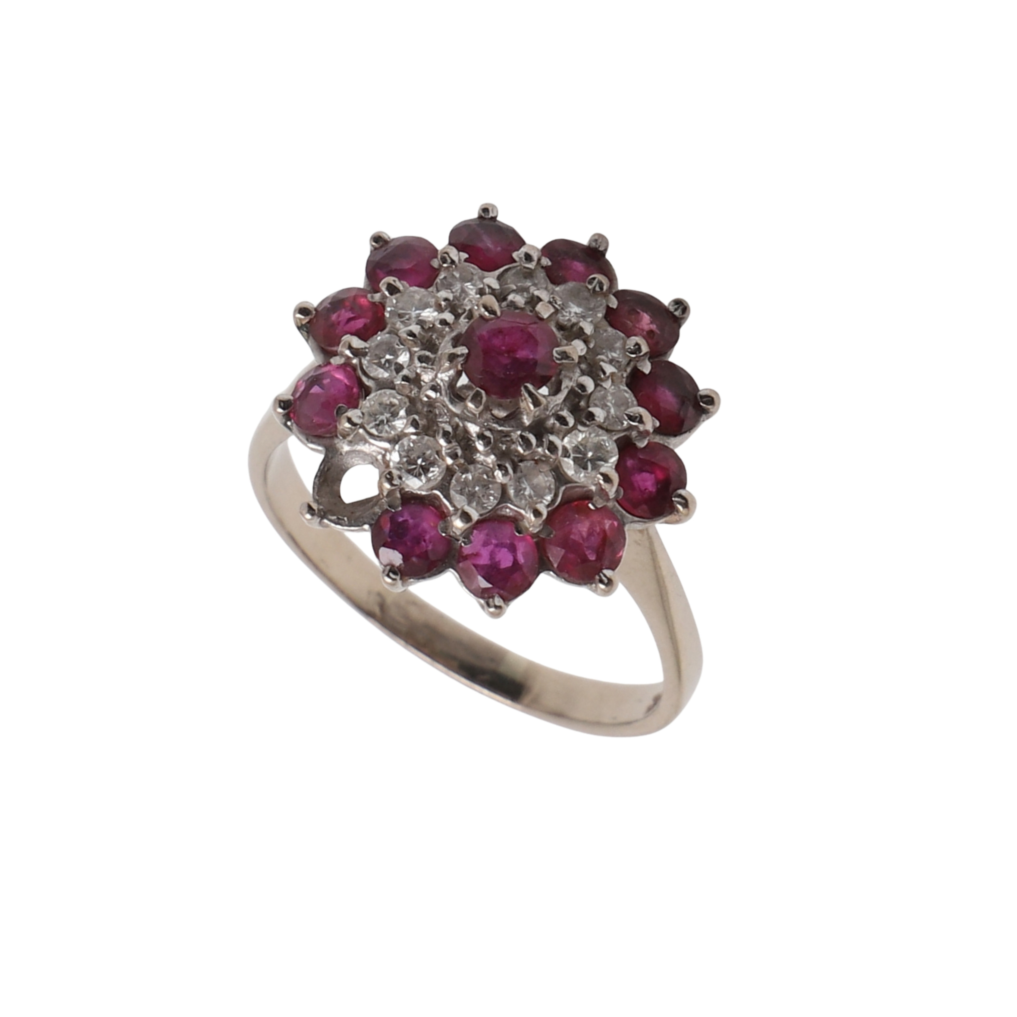 4994359. AN 18CT GOLD, RUBY AND DIAMOND CLUSTER RING.