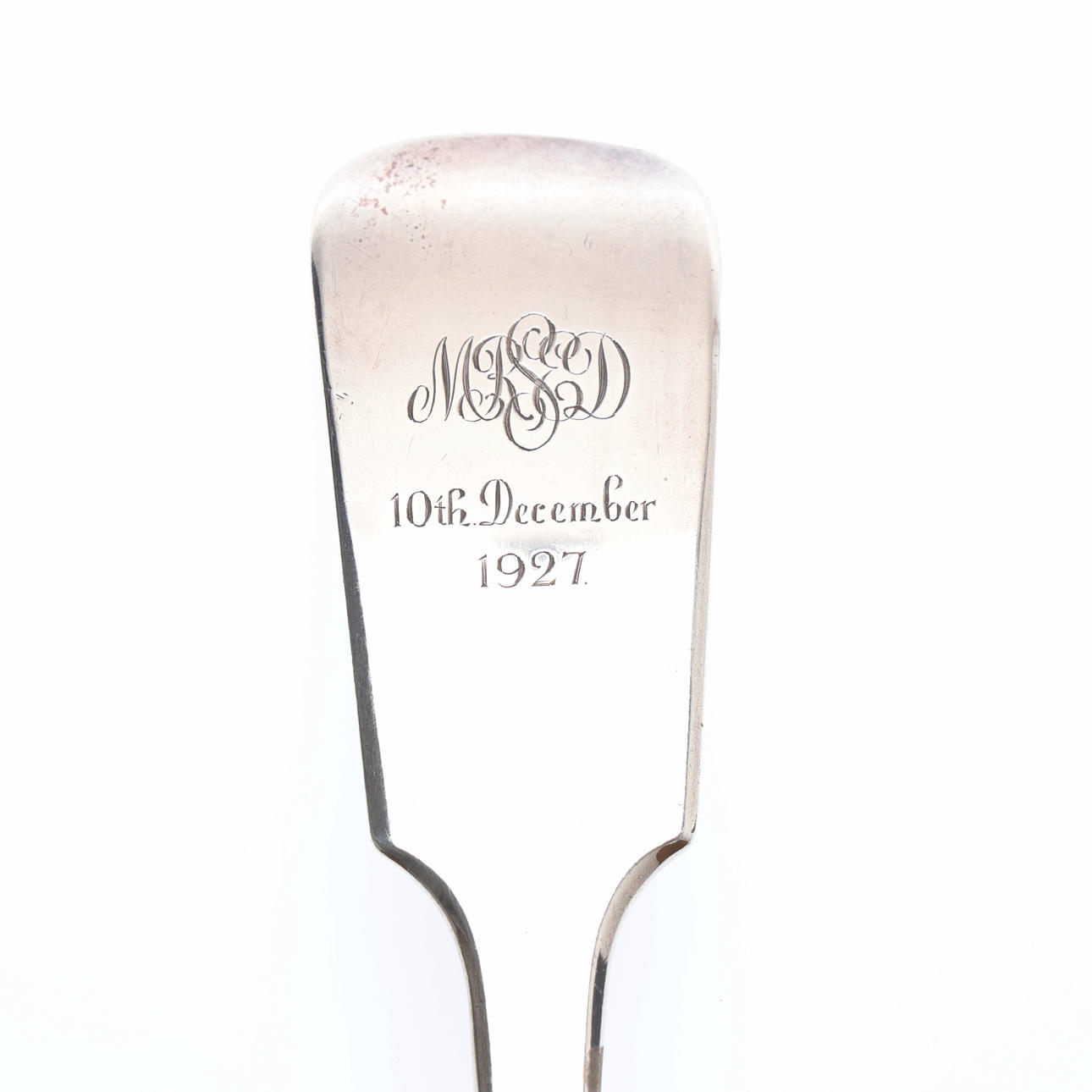 With later engraved initials "M R S E D" and date 10th December 1927, Jonathan Hayne, London, 1831, L.33.5cm, 269grs.