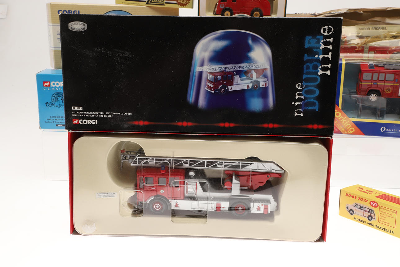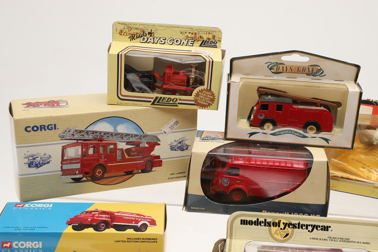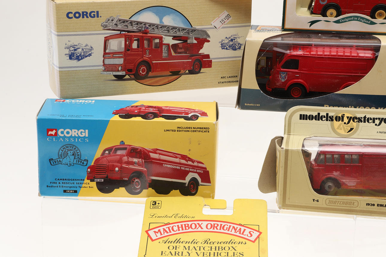 Including Corgi boxed 10305 Merryweather Fire Engine, 97352 AEC Fire Engine, 19201 Fire Tender, reproduction boxed Dinky Toys, boxed Renault 1000 KG, and other items.