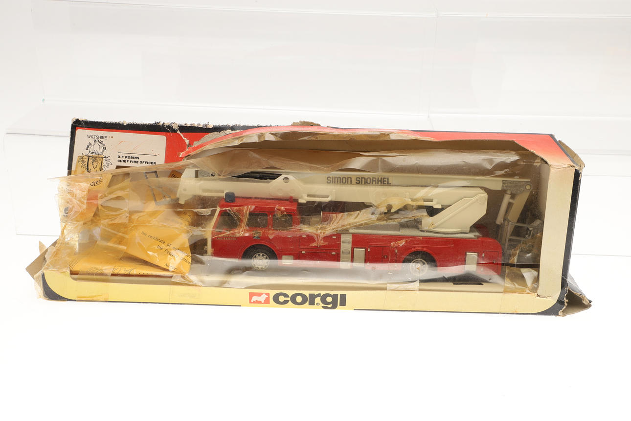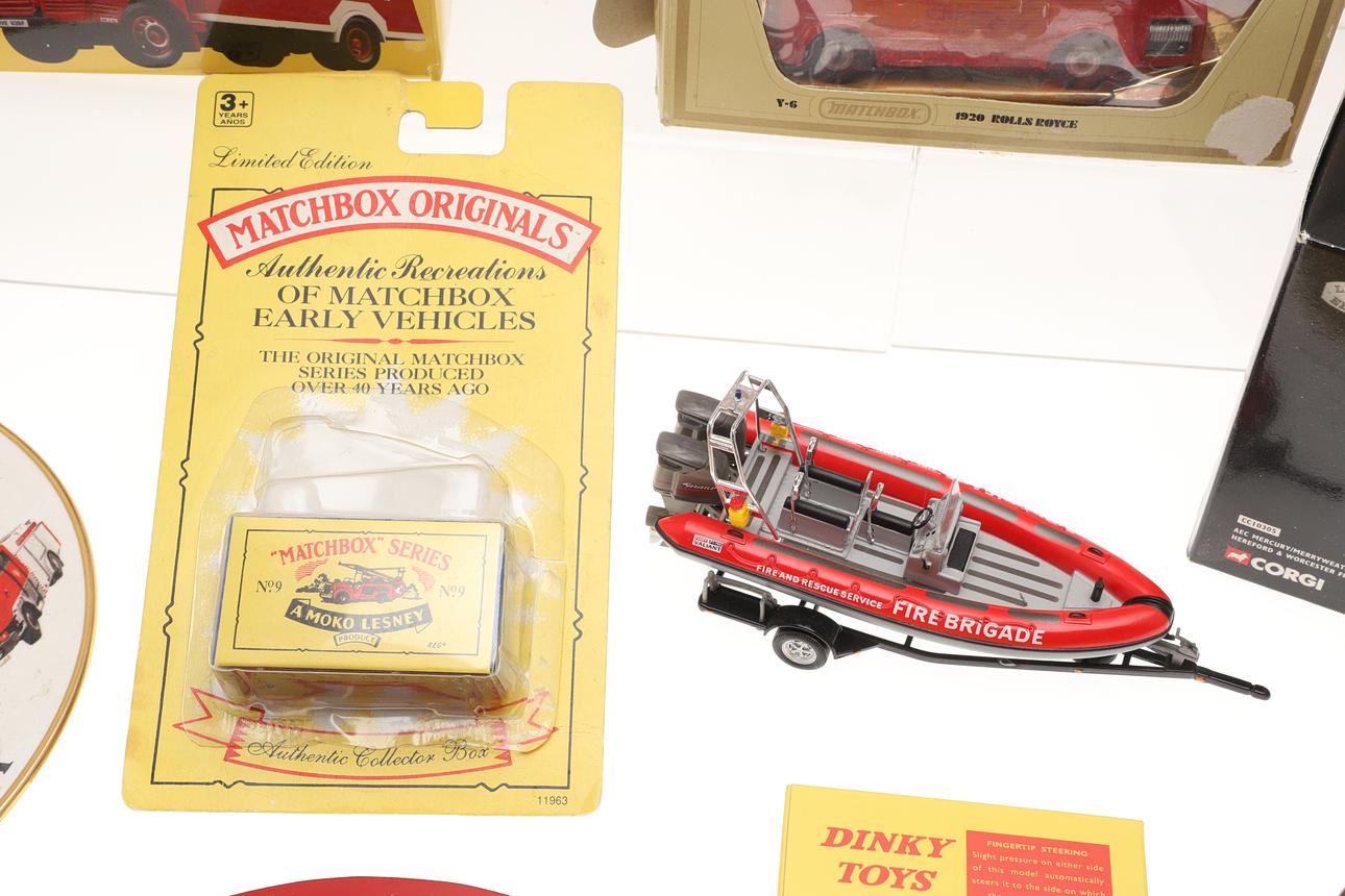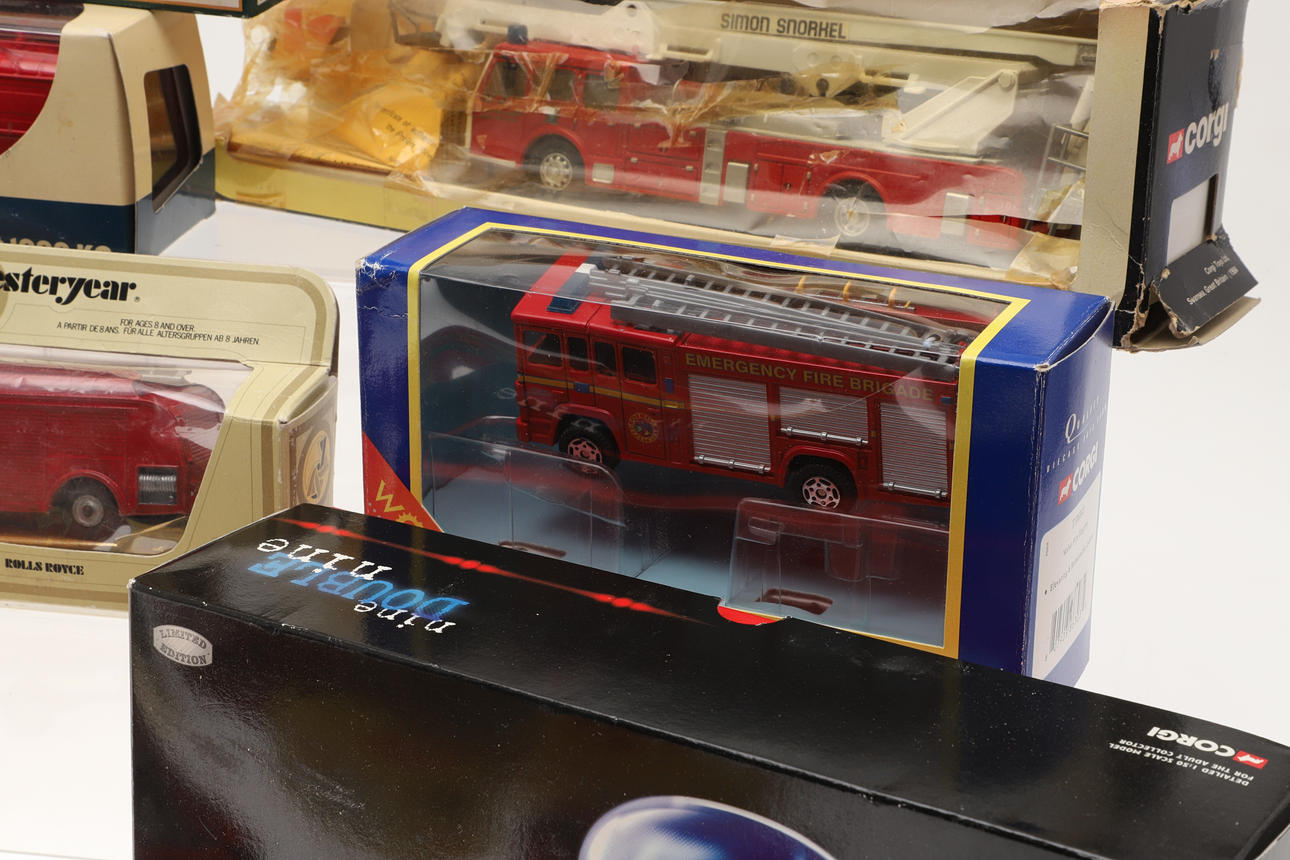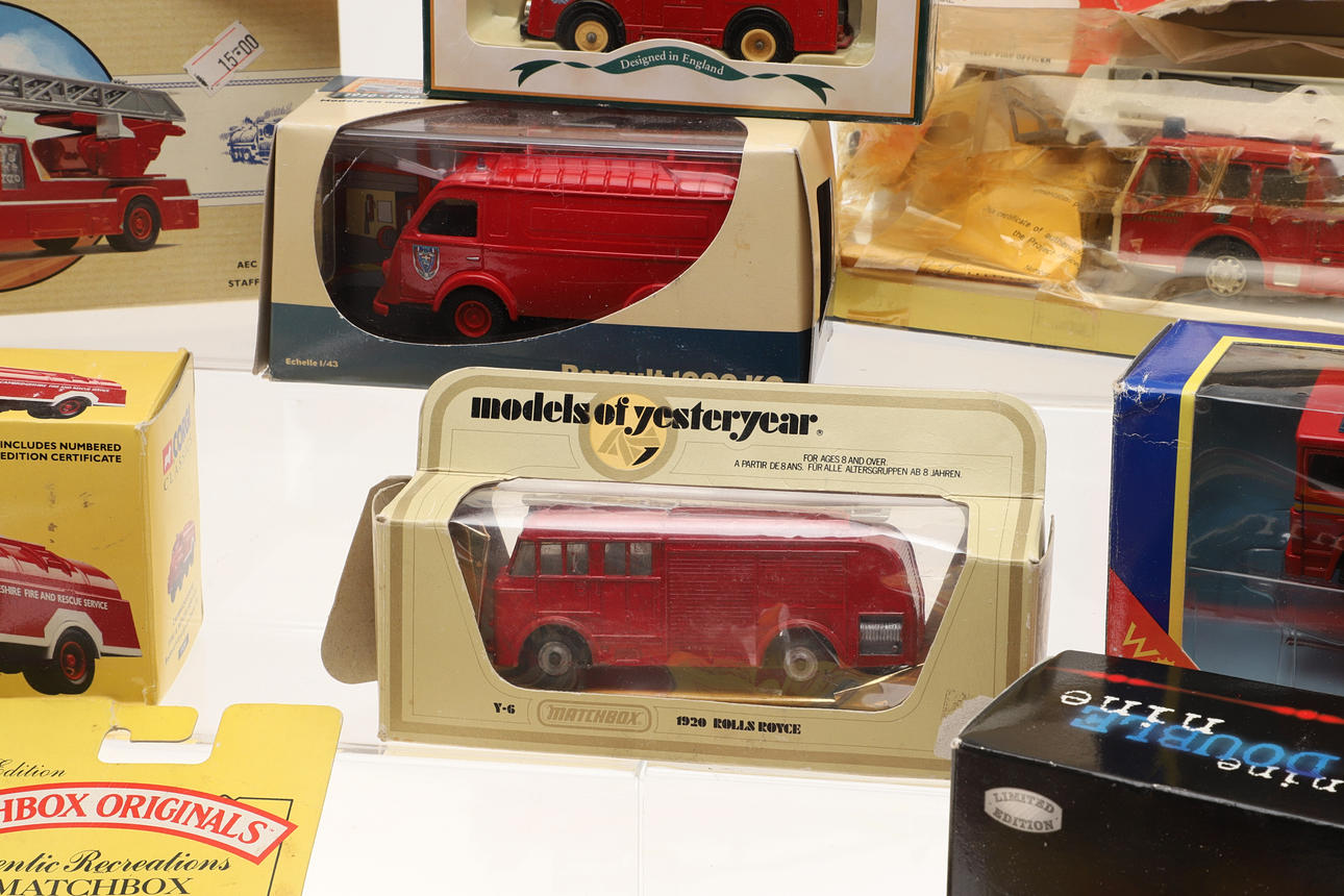 Including Corgi boxed 10305 Merryweather Fire Engine, 97352 AEC Fire Engine, 19201 Fire Tender, reproduction boxed Dinky Toys, boxed Renault 1000 KG, and other items.