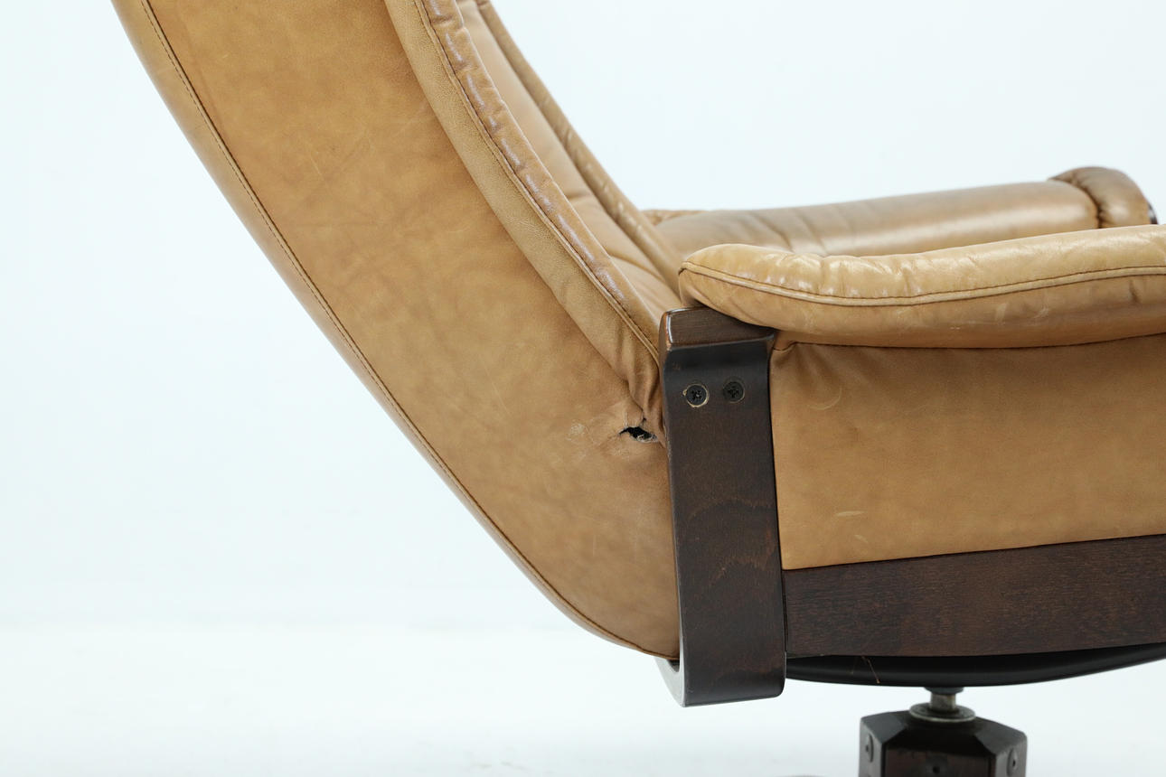 Stained wooden frame, solid upholstery, cognac coloured leather.