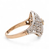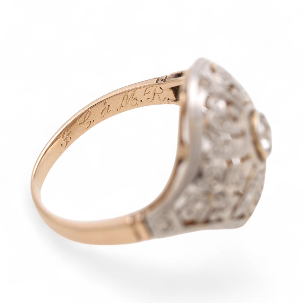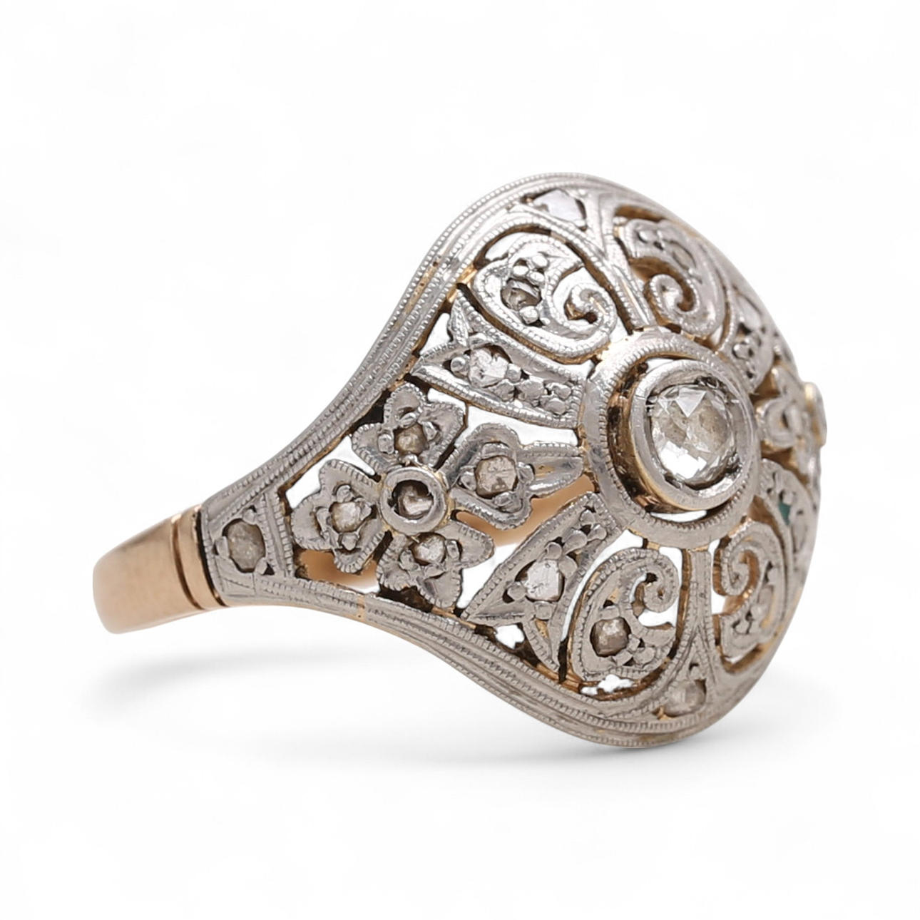 Slight damage on one side of the setting. A rose cut diamond is missing.