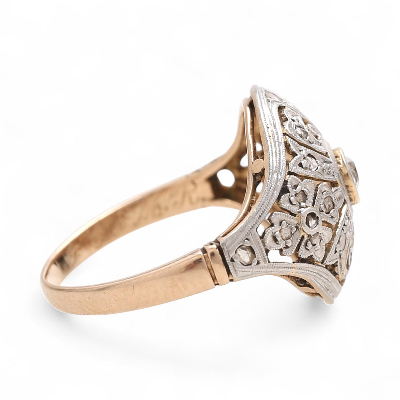 18K gold with platinum views and old brilliant and rose cut diamonds, approx. 0.14 cts. Size 14/54. 3.3 gr.