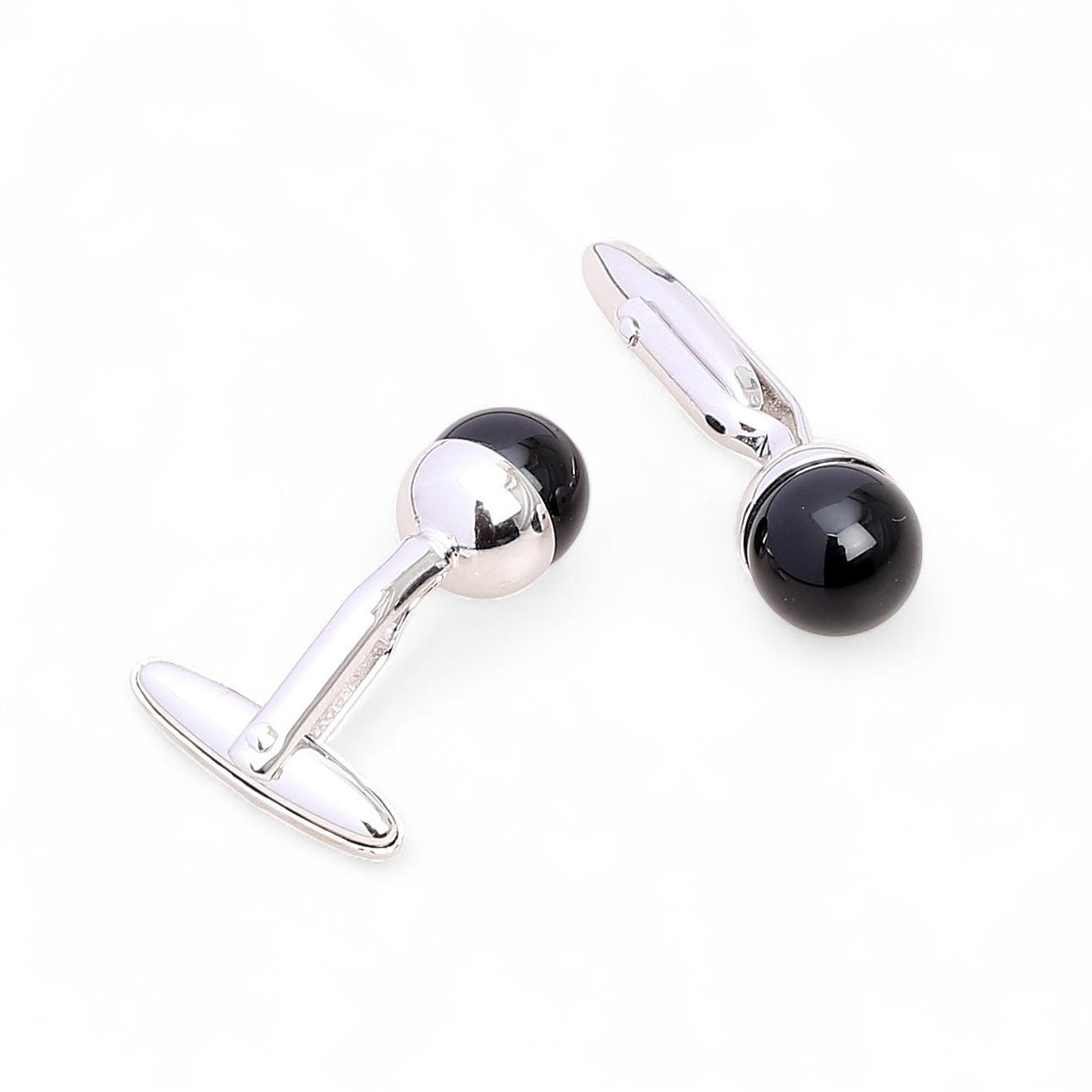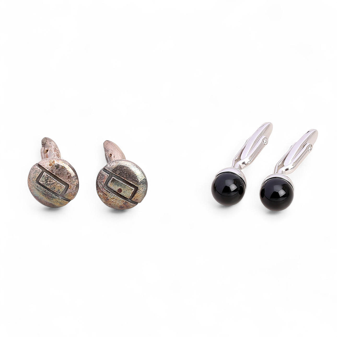 A pair of cufflinks in silver. 1.5 cm. The other pair in silvery metal and enamelled cabochon. 1 cm.