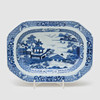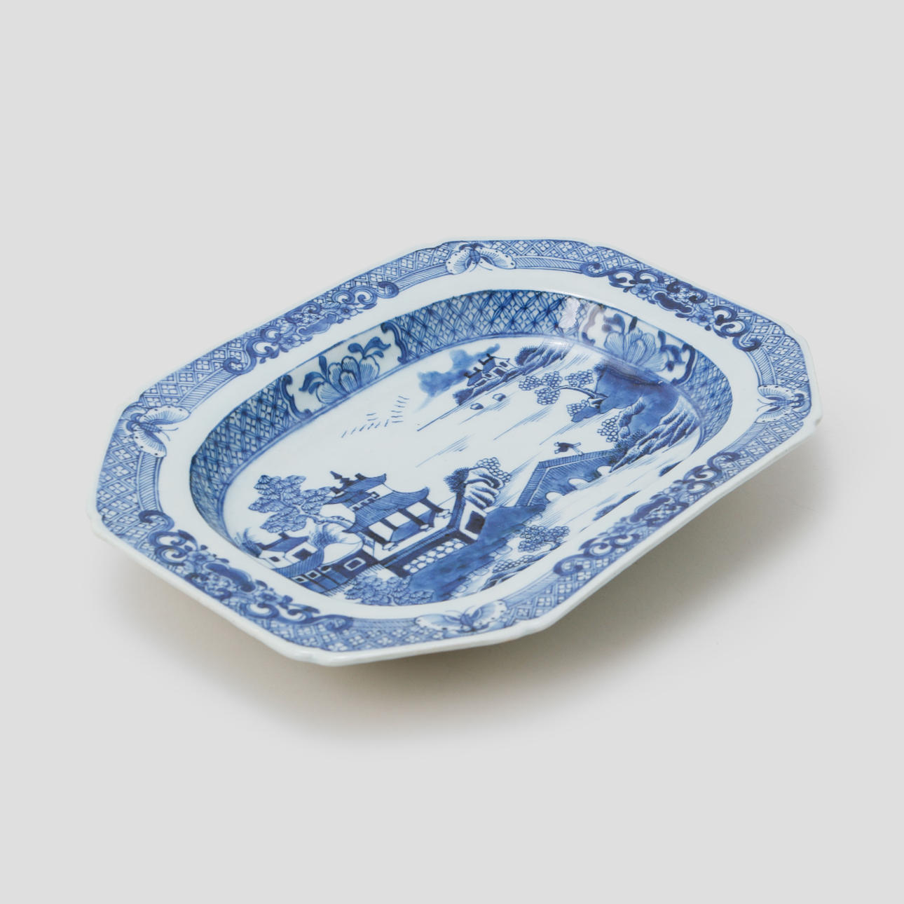 Pagoda landscape decor in underglaze blue. Length 28 cm.
