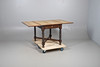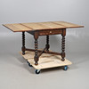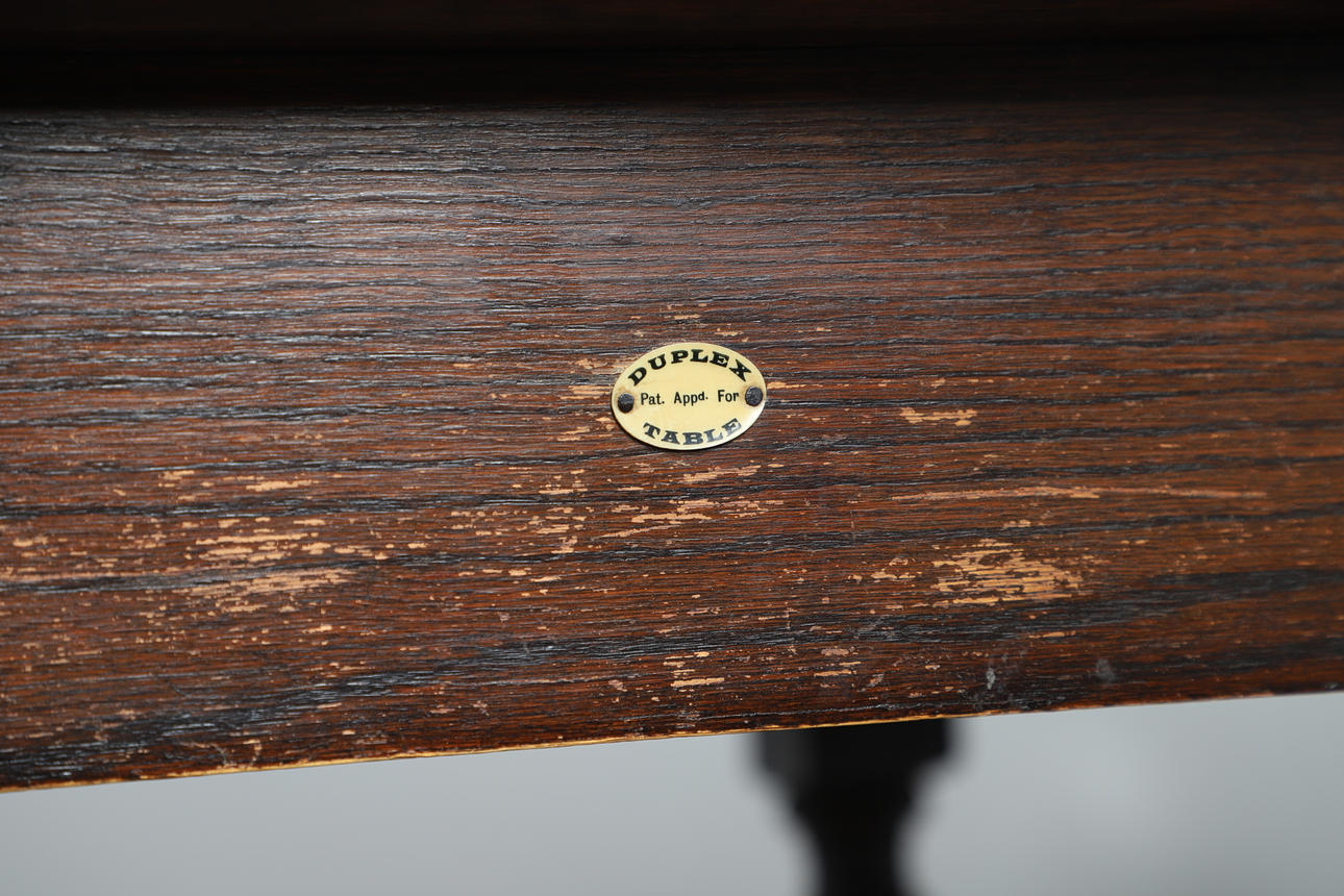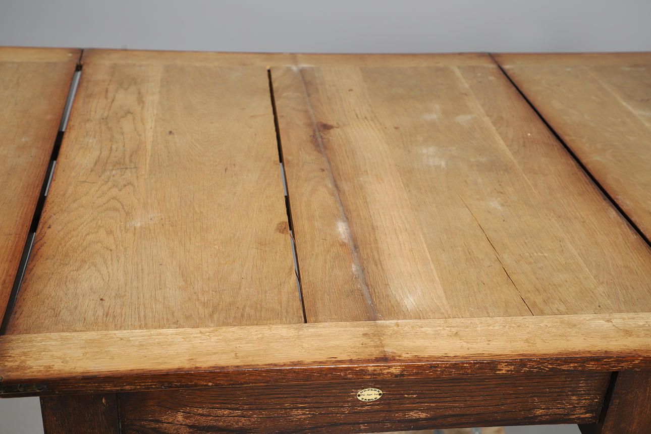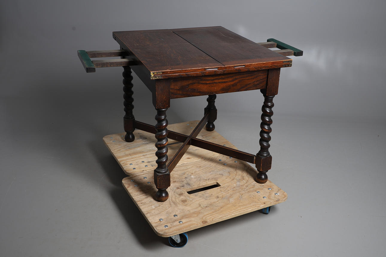 An unusual oak draw leaf table, with flaps on the top that fold over supported on sections that pull out on each side. Supported on barley twist legs and cross supports, and with a retailers label on one side for 'Duplex Table'. Extended 90.5cms by 150cms, closed 90.5cms by 74.5cms, 75cms high.