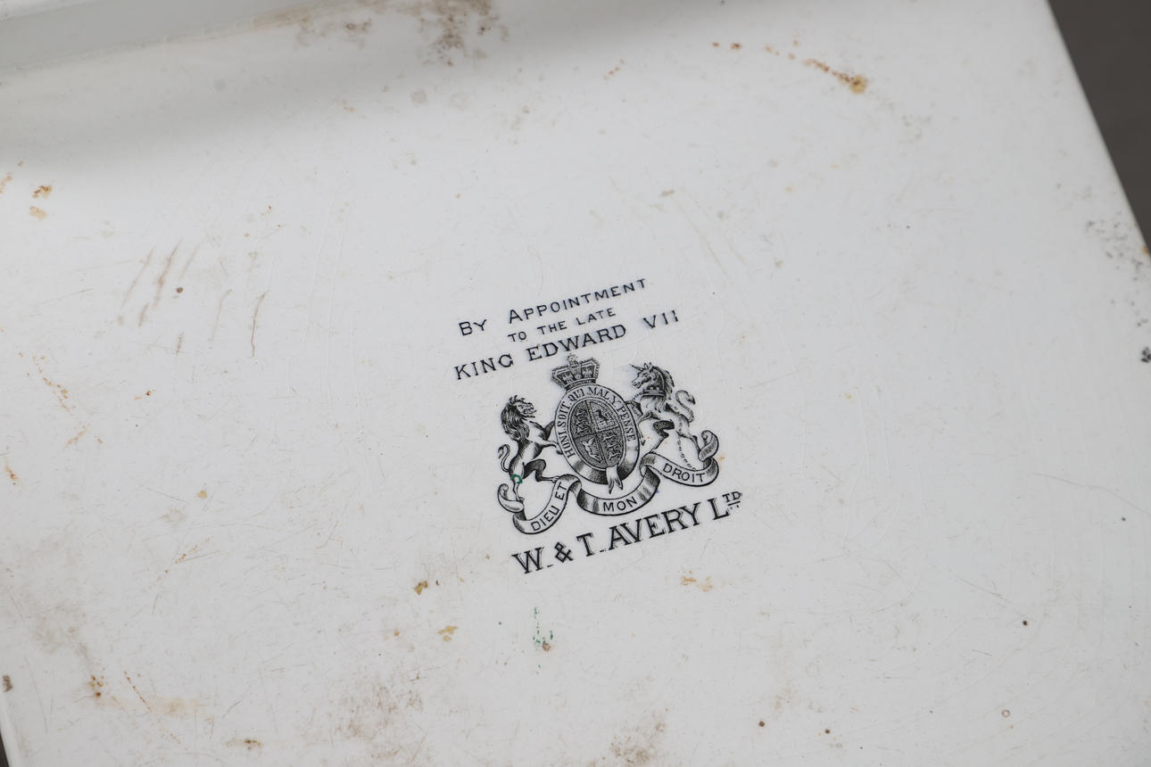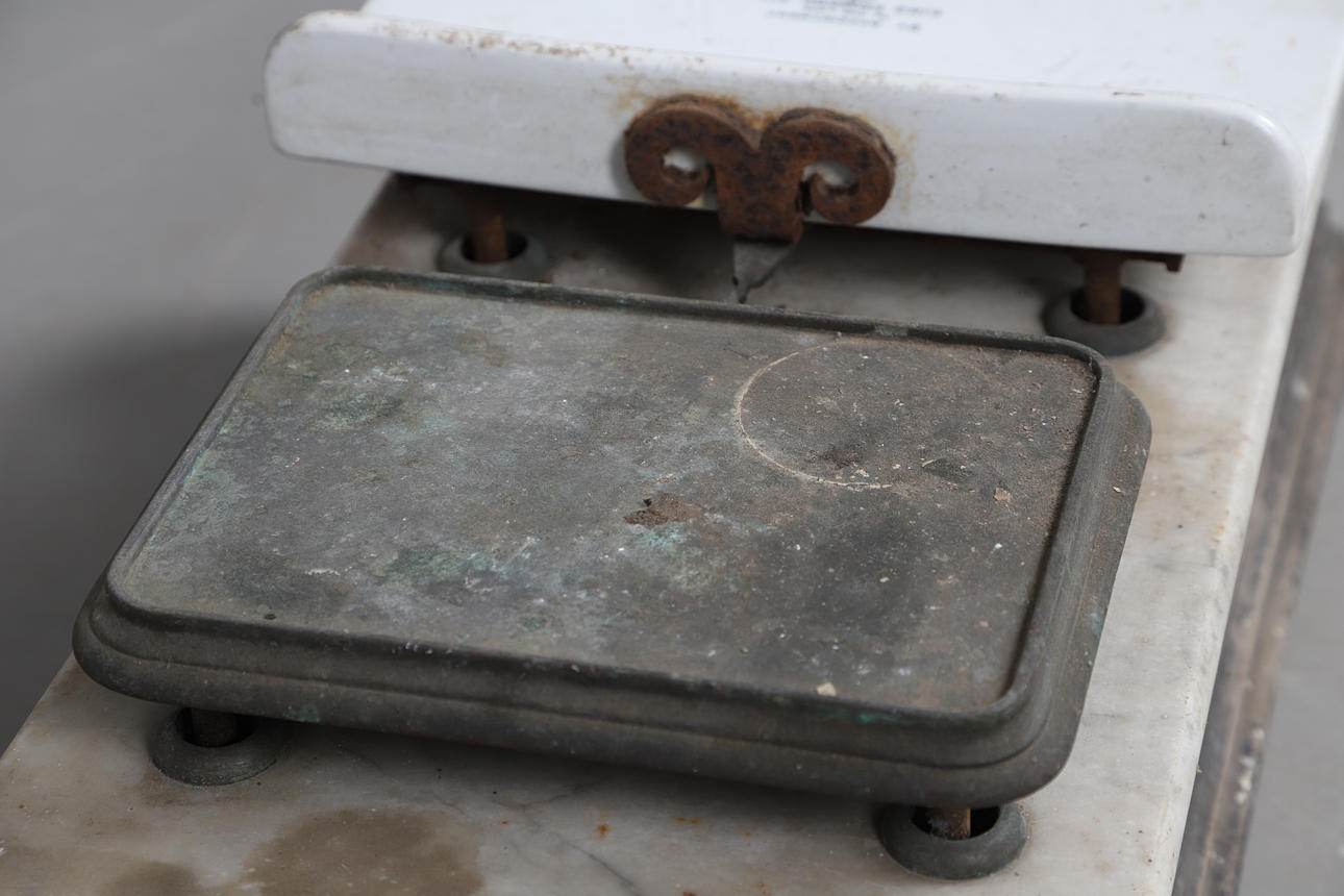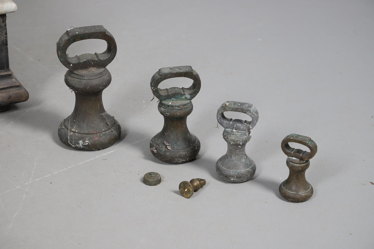 A large set of early 20thc Avery scales, with a pottery weighing section supported on a marble section and painted wooden base. Also with some weights of differing sizes (largest 18cms high). Scales, base 67cms by 33cms, 28cms high.