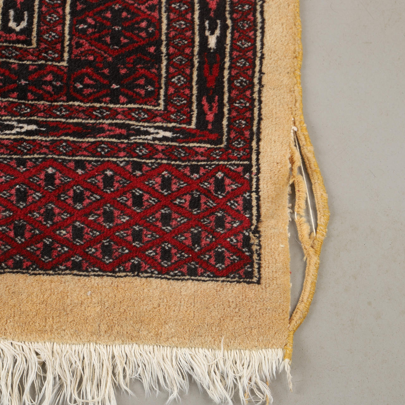 Normal wear and tear, edge damage, fringe wear, stains.