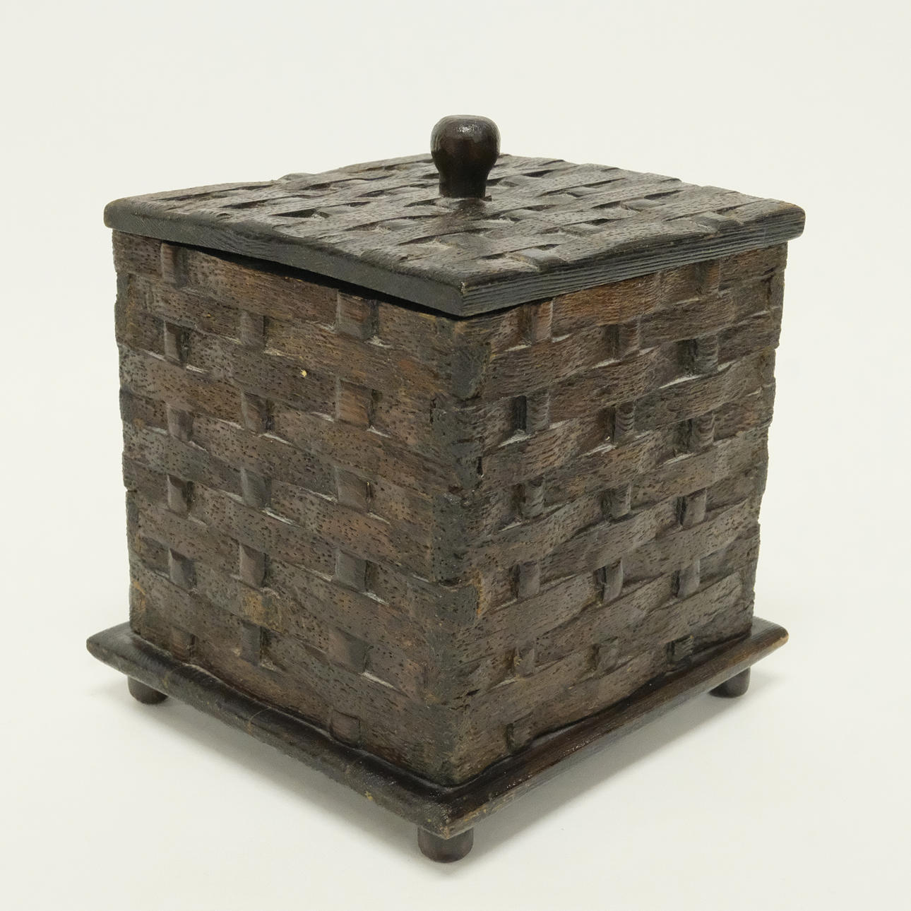 Box, cut wood decor, dated ELLEN 1892, height 7cm, diameter 7,5cm.