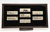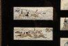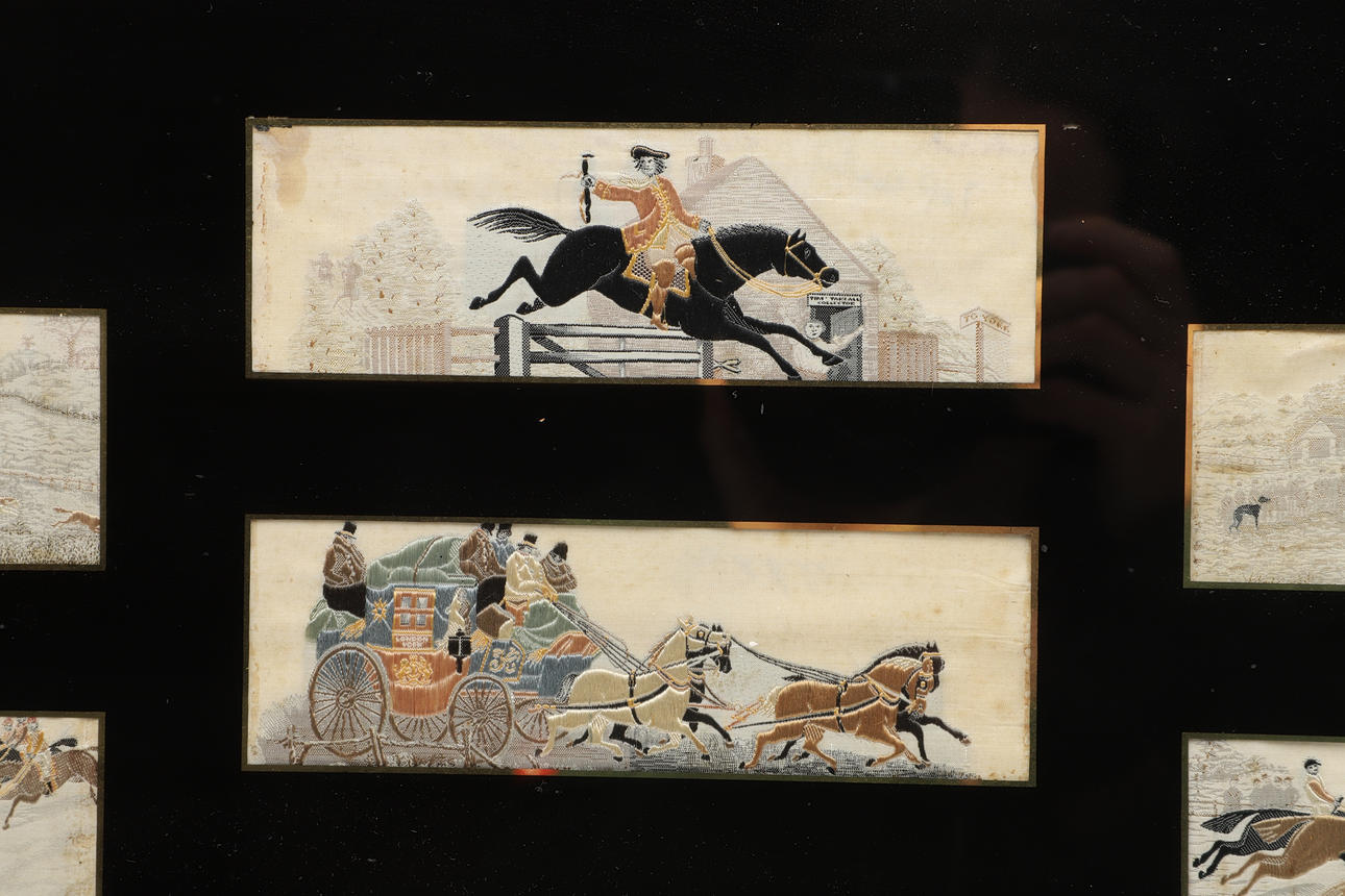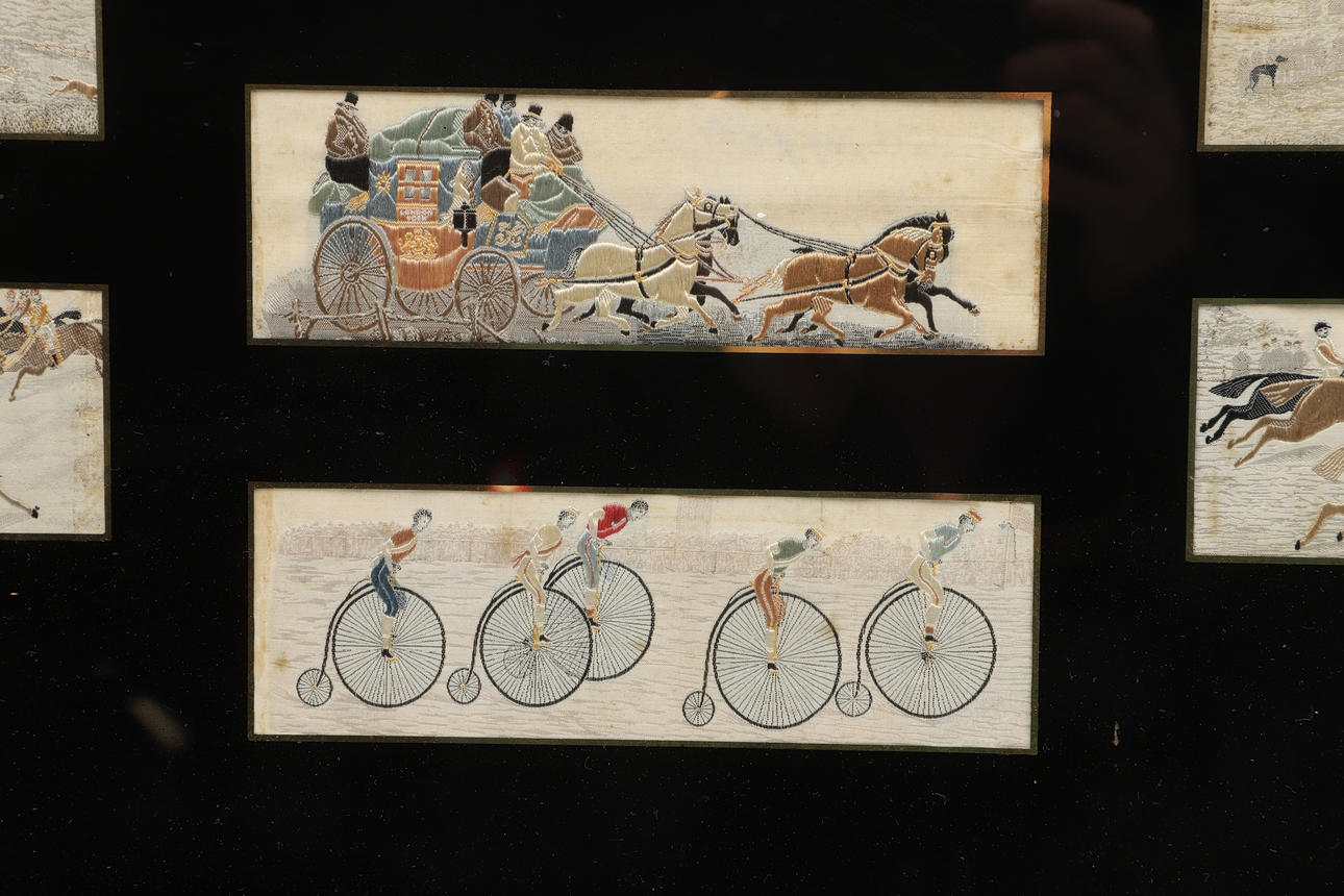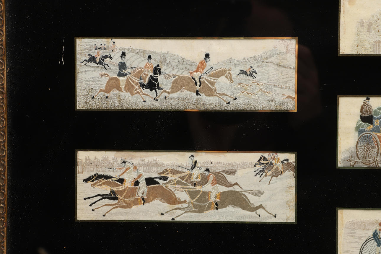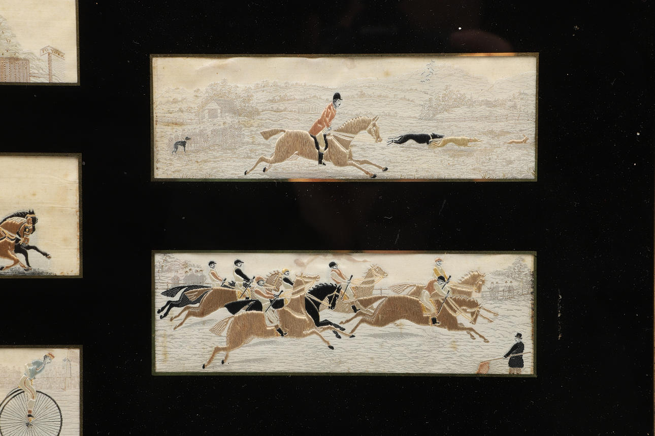 A set of seven silk stevengraphs, including a Penny Farthing race, Horse Racing, Hunting etc. Mounted in an ebonised frame with black mount around the silks. Frame 64cms by 34cms.