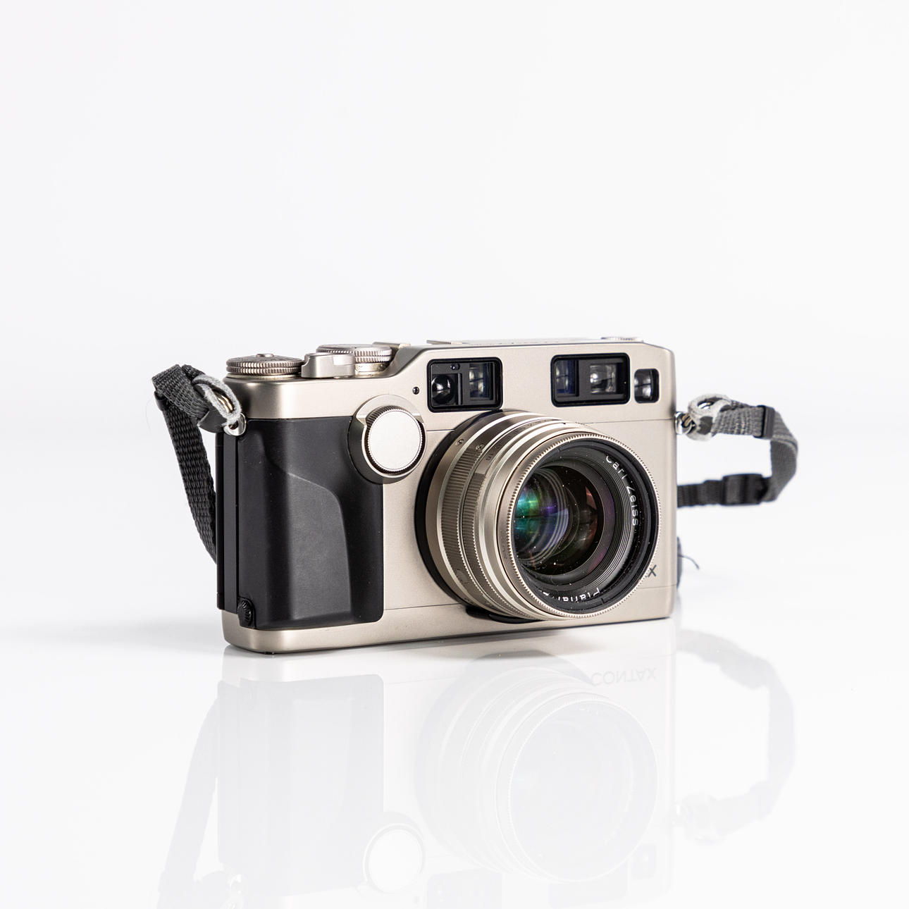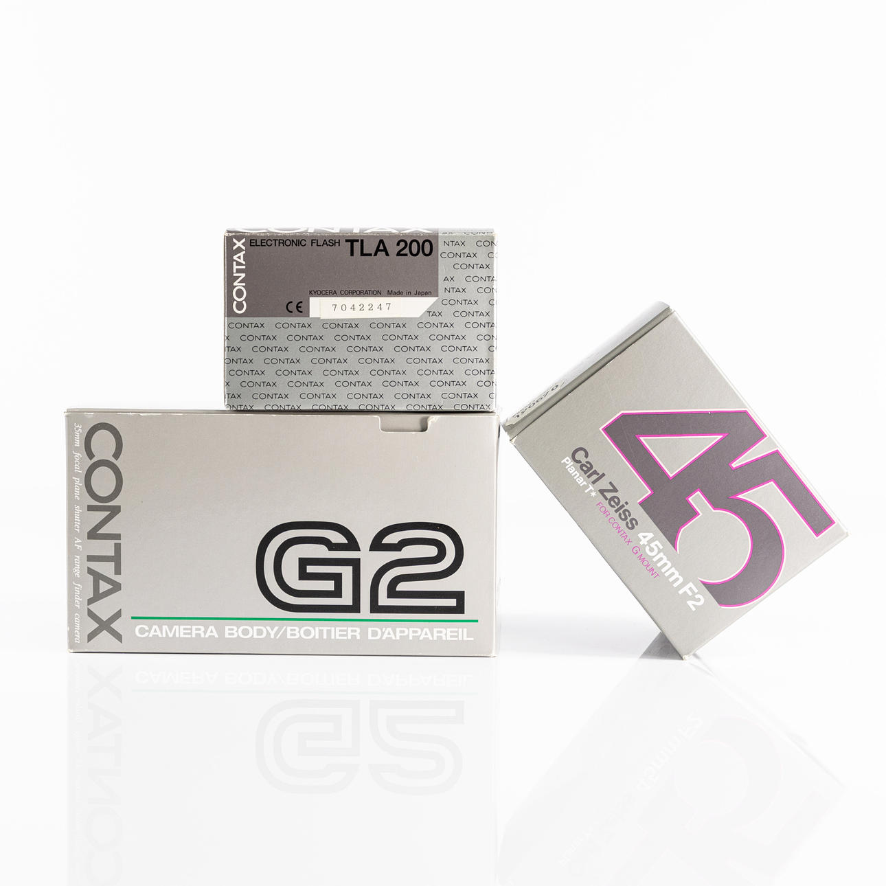 System camera, Contax G2, Optics; Carl Zeiss Planar 45 mm/ 1:2, Carl Zeiss Sonnar 90 mm/ 1:2.8, both with original UV filter, Flash; Contax TLA 200, circa 1990s, Japan, comes with carrying case marked Lowepro