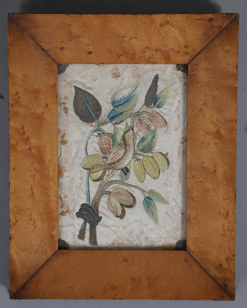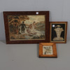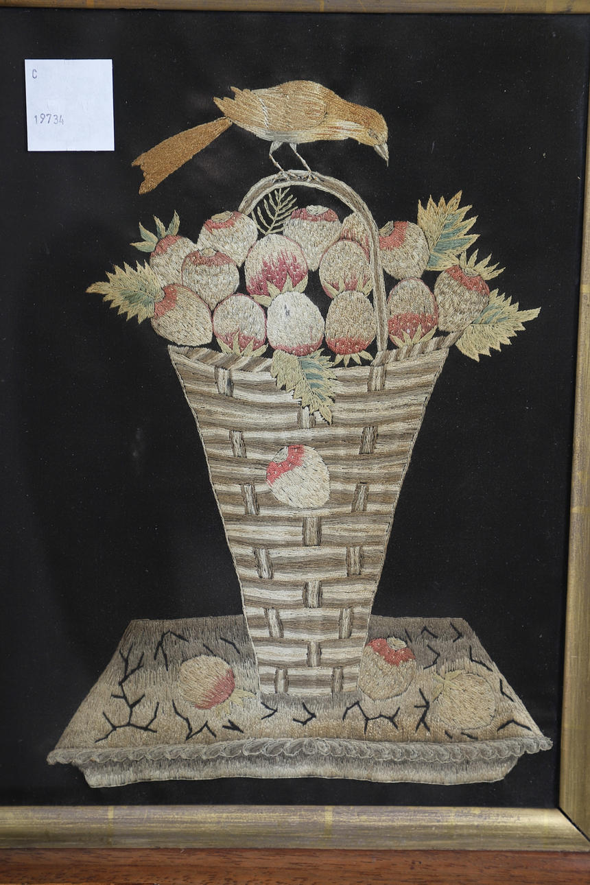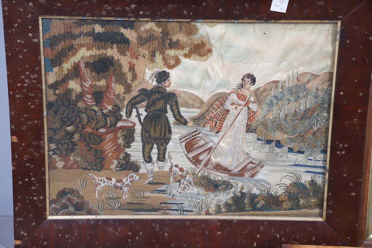 Including a large embroidered picture of figures in a landscape scene including a lady in a boat, framed (frame 70cms by 53.5cms, embroidery 56cms by 40cms). Also with an embroidery of a bird and flowers in a maple frame (frame 33cms by 26cms), and a basket of fruit in a mahogany frame (frame 35.5cms by 28cms). (3).