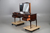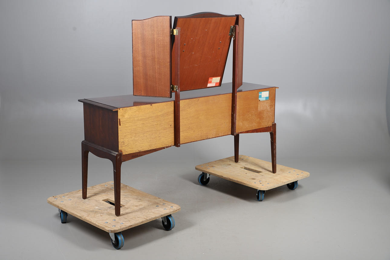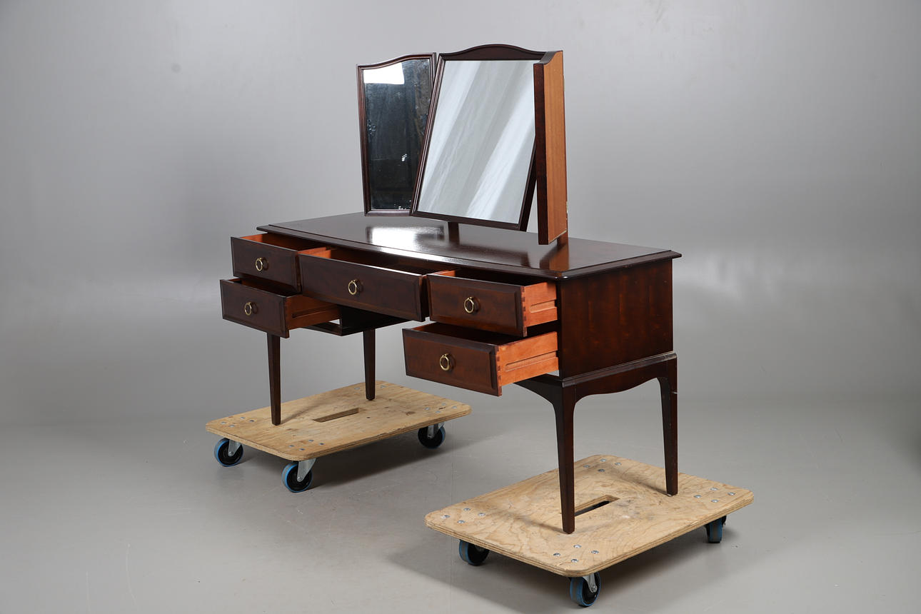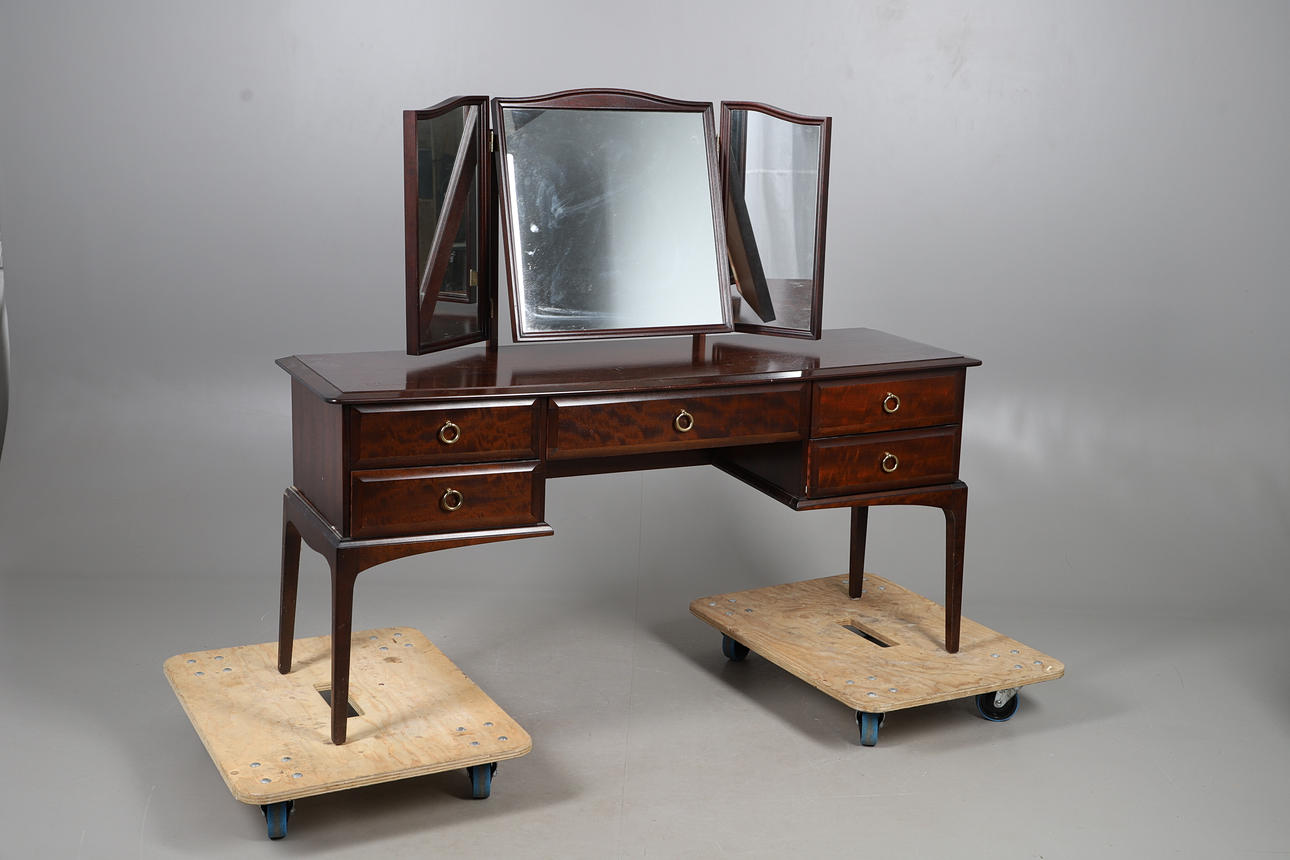 STAG DRESSING TABLE WITH A PAIR OF BEDSIDE TABLES.