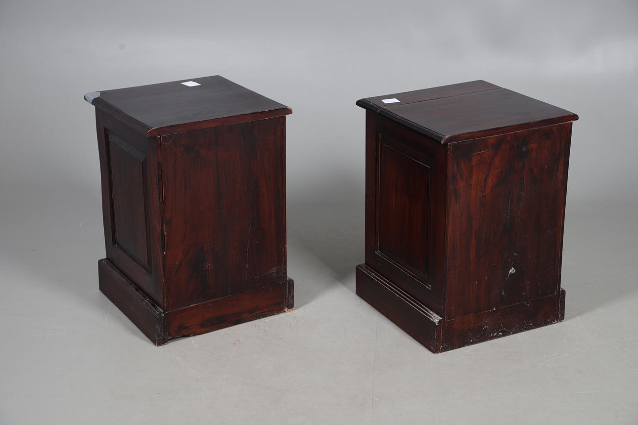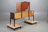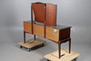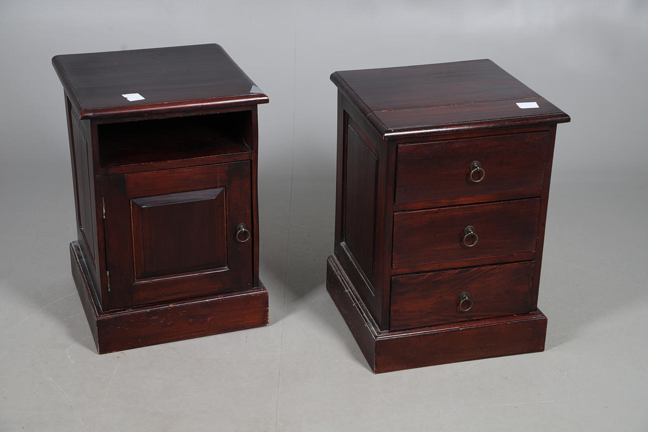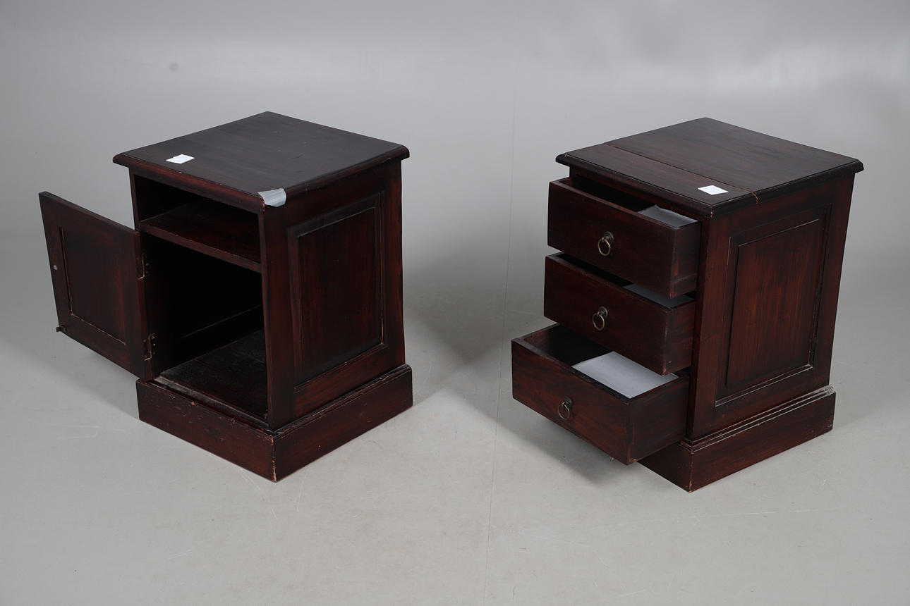 Bedside table with single long drawer flanked by four short, W152 x H122 x 50cm, one beside table with three drawers and the other with a single vacant compartment, W42 x H60 x D42cm (3).