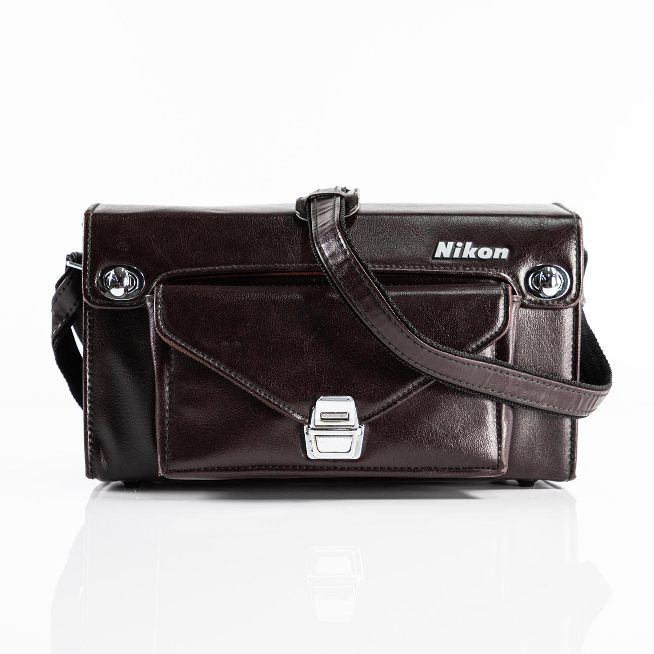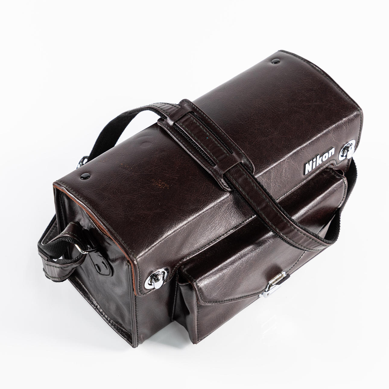 Carrying case in maroon artificial leather, Nikon, ca 1970/80s, Japan, dimensions 30x16x18 cm.