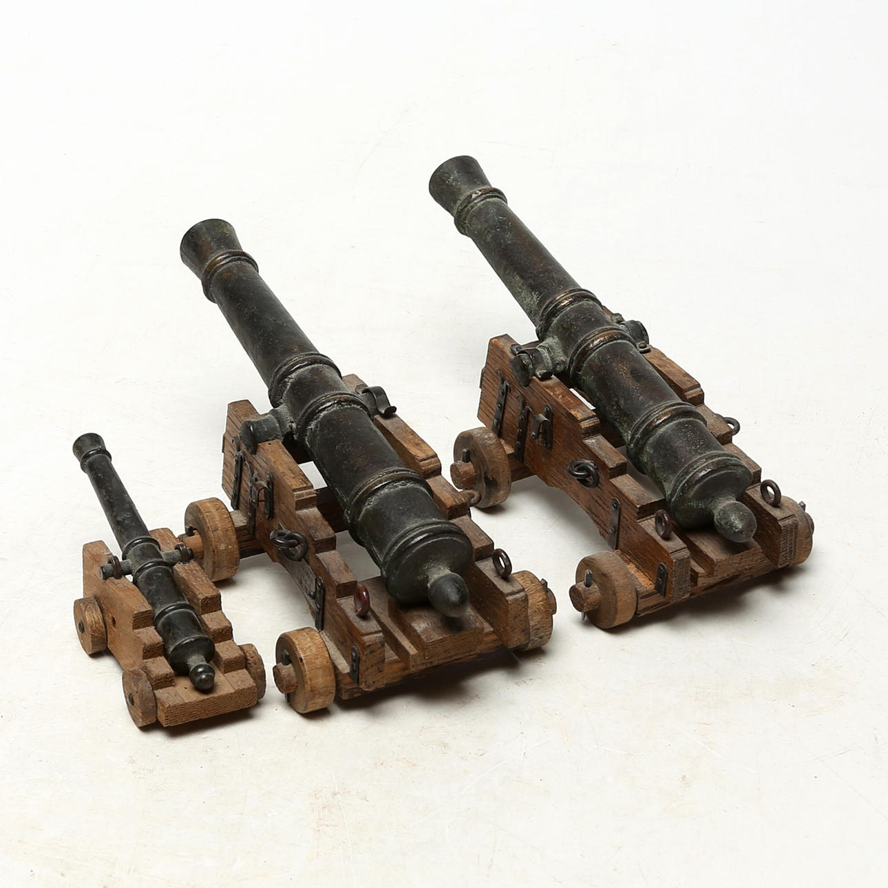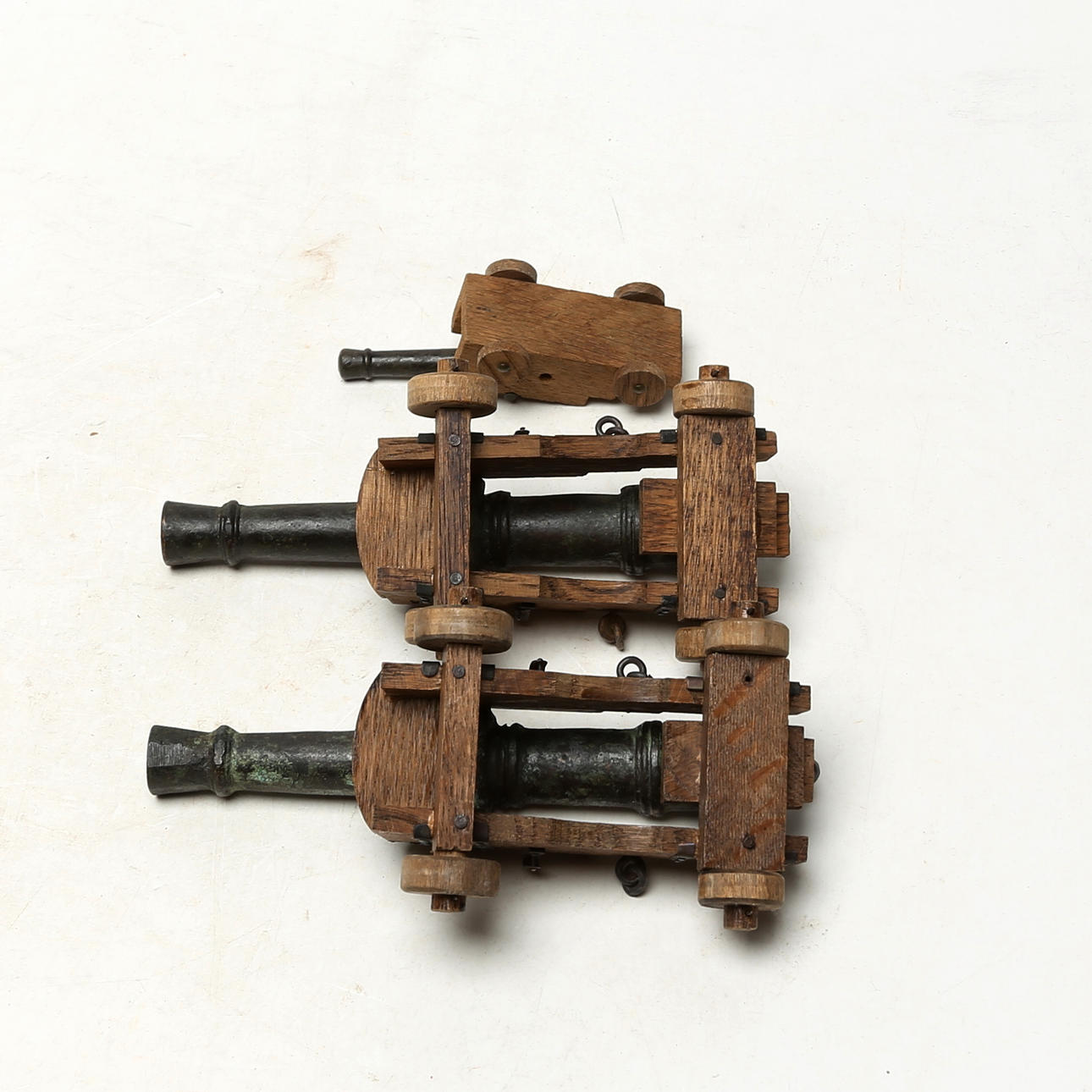 MINI CANONS, 3 pcs, bronze/wood.