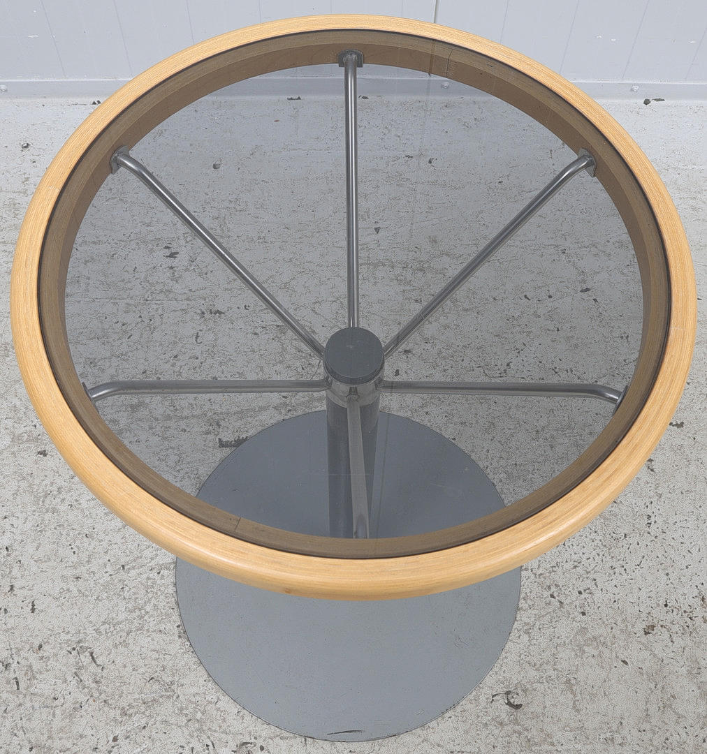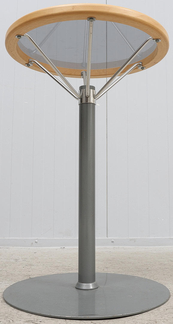 With loose glass top. Height approx. 74 cm. Diameter approx. 48 cm. Unmarked.