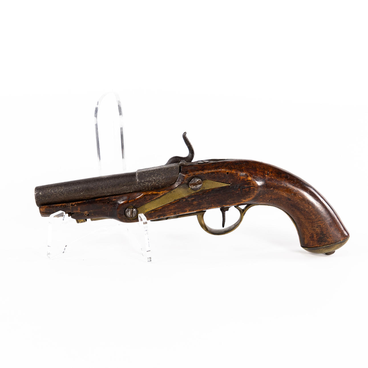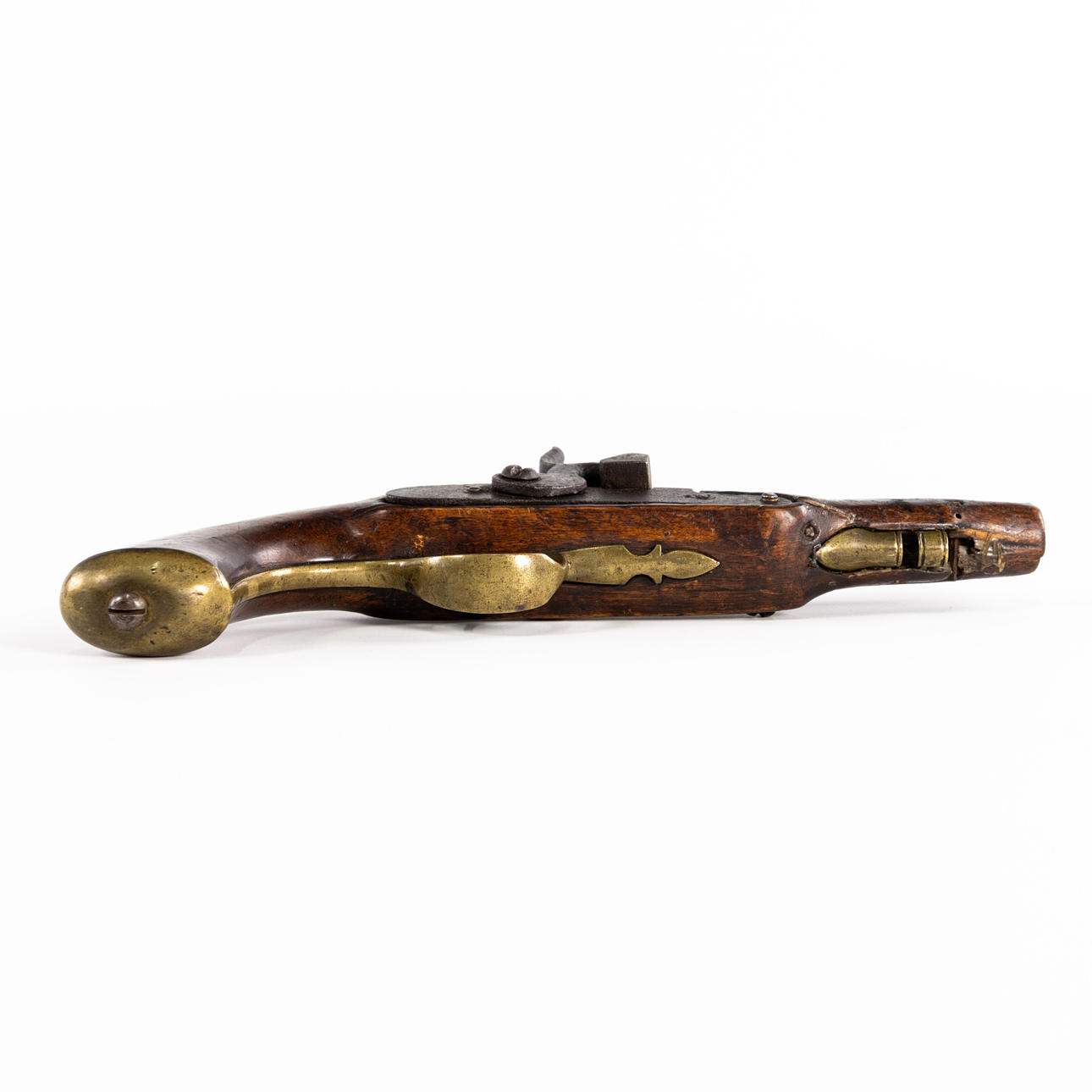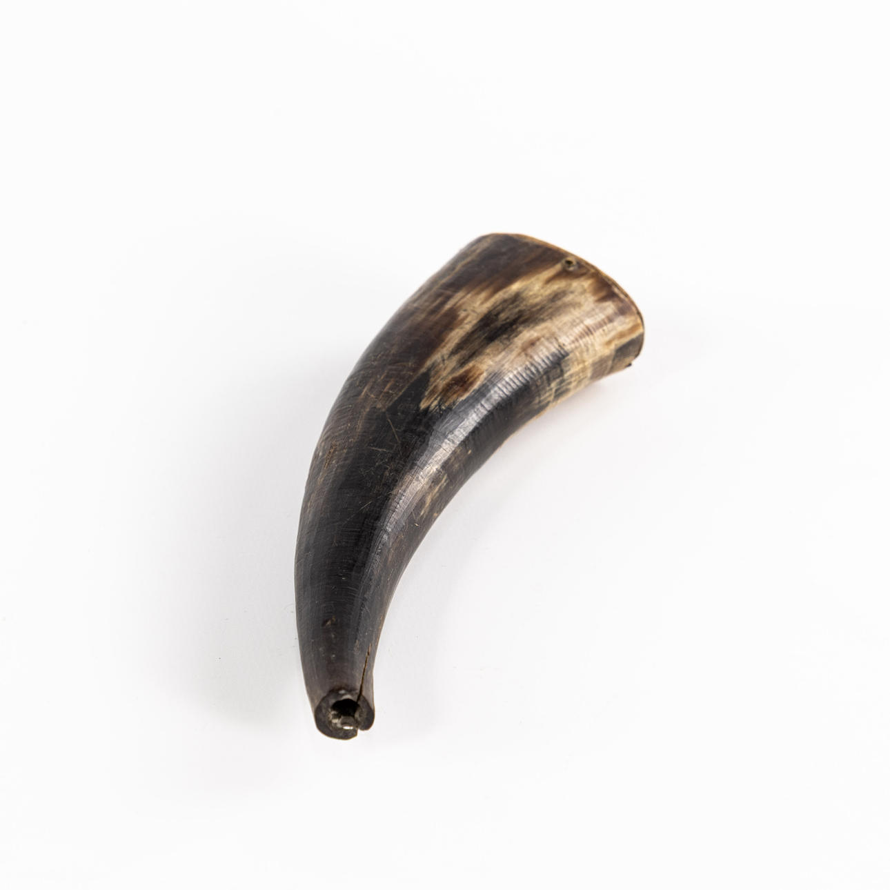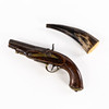 Older Slaglock pistol and gunpowder horn, 19th century, length 22 cm and less.