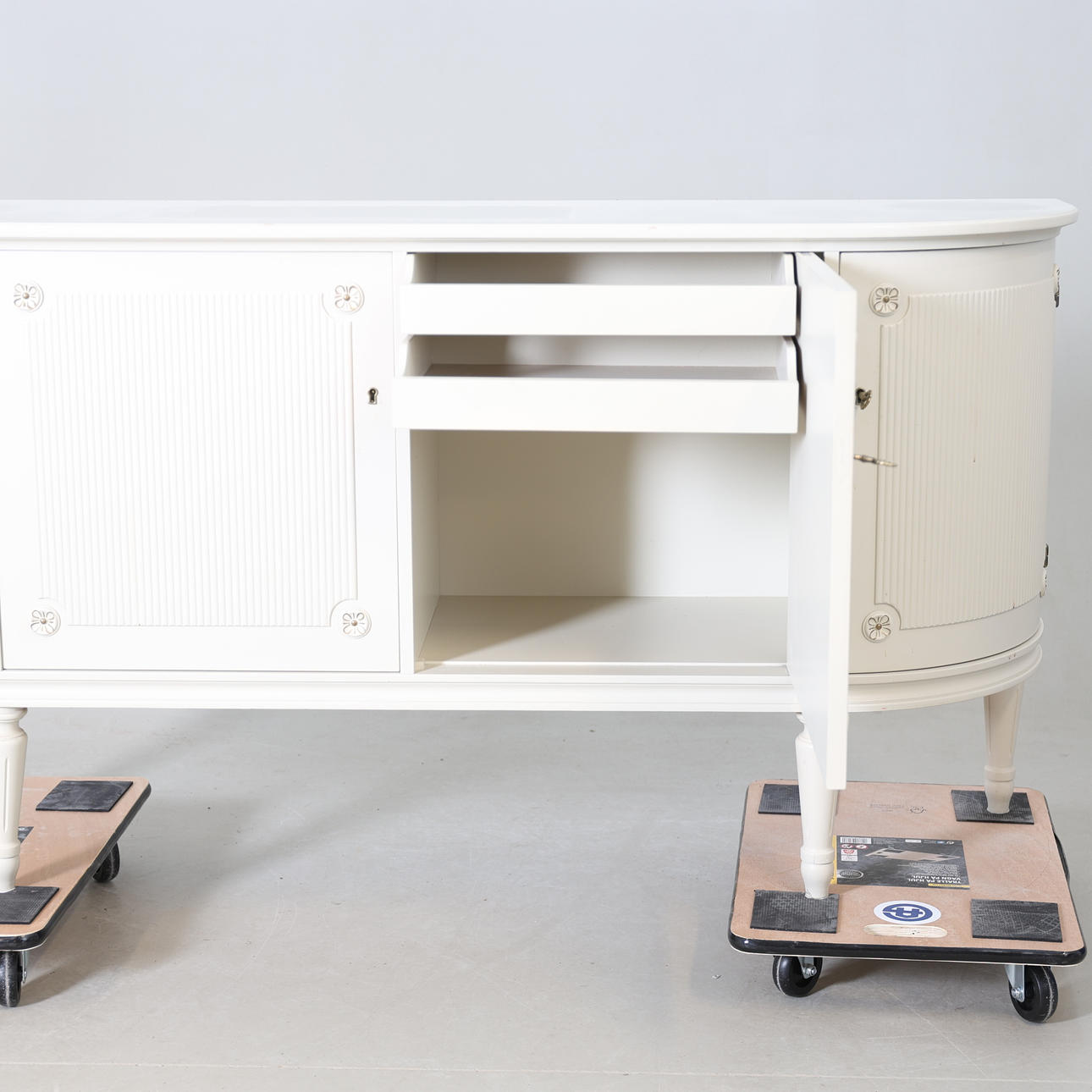 Painted wood. Four doors with rear shelves and doors.