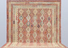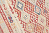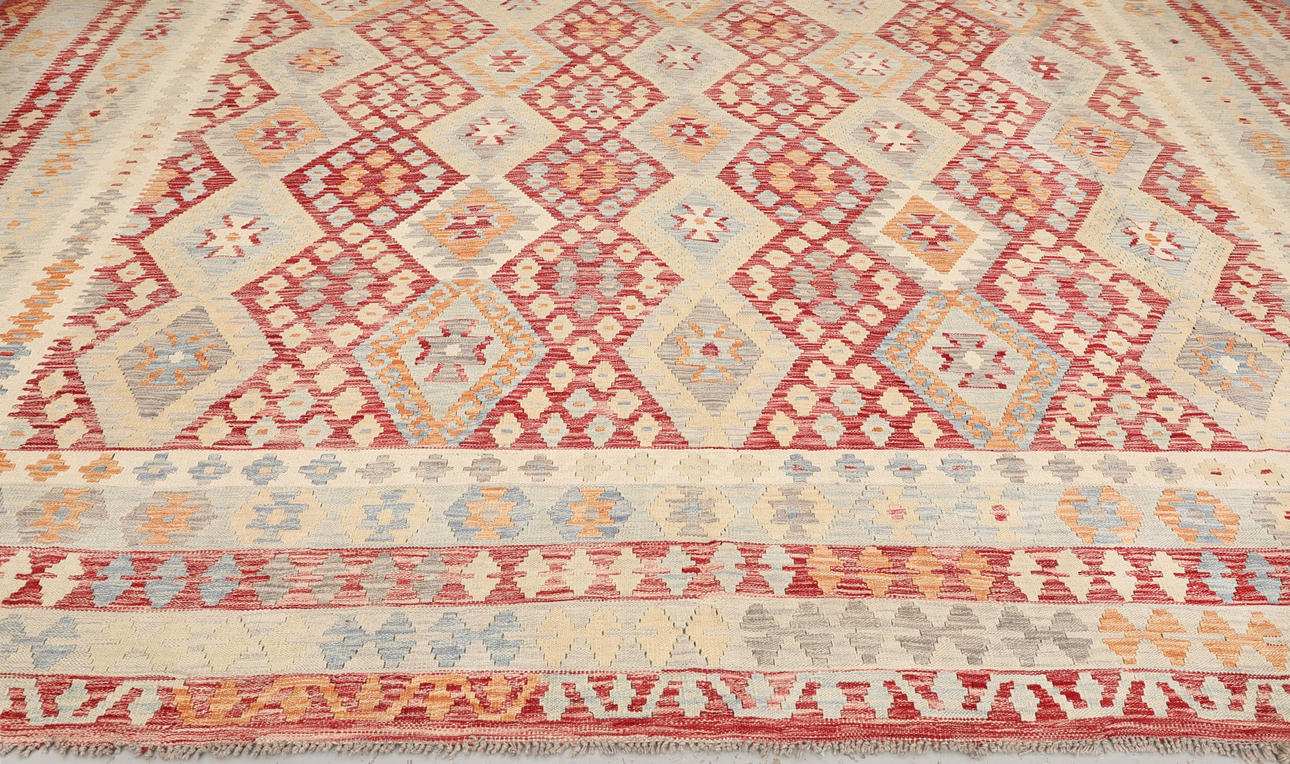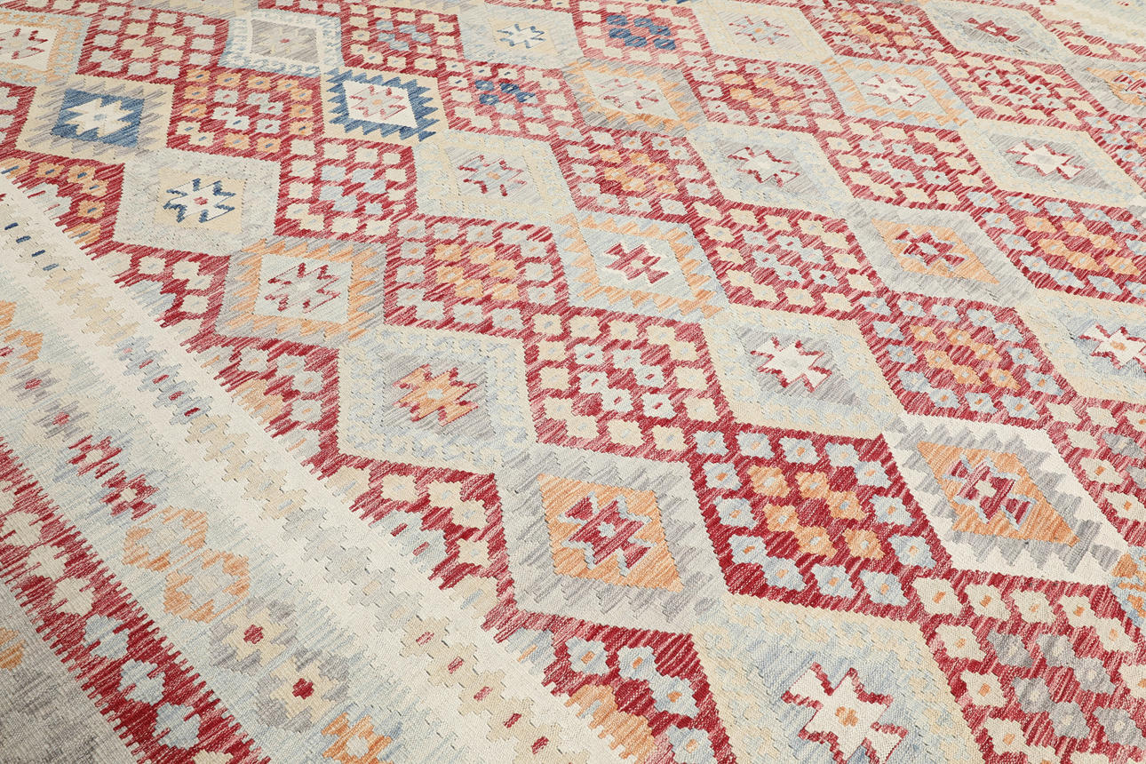 Hand-woven Kelim in classic design with geometric pattern in polychrome color scale.