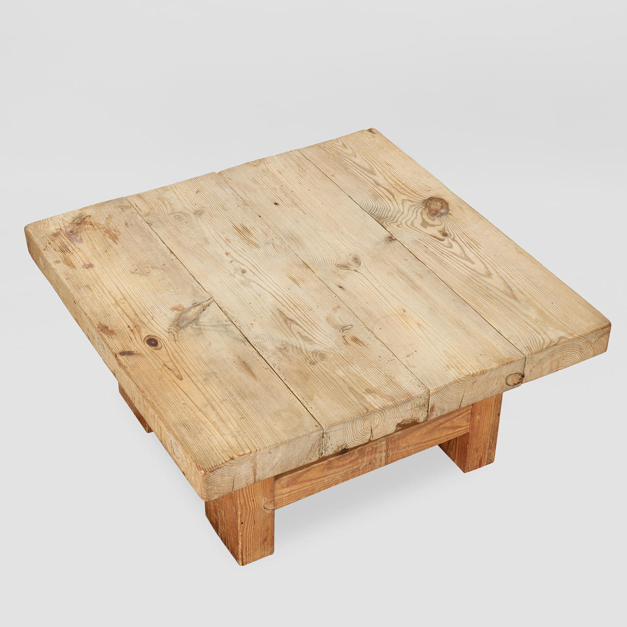 Square coffee table made of solid pine. Designed by Jens Lyngsøe and presumably executed at Anton Dam from demolition timbers from old buildings.