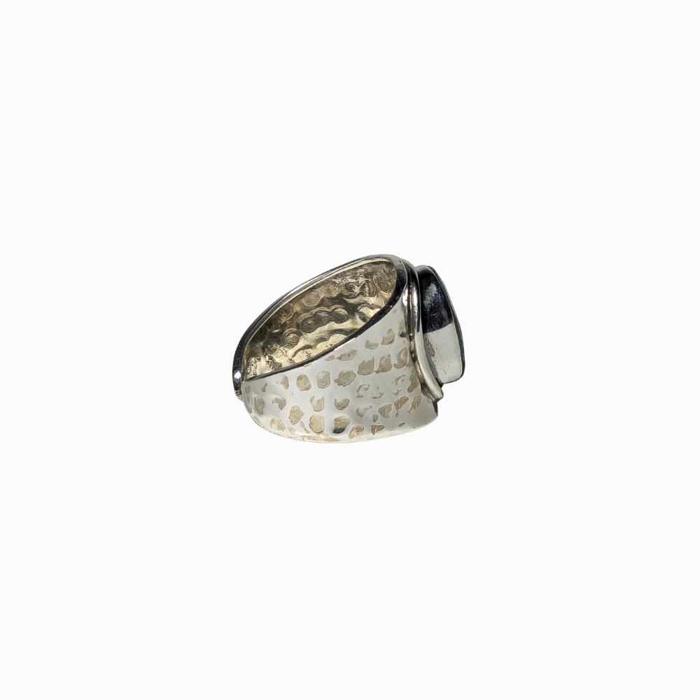 4997466. HAMMERED SILVER RING WITH OVAL CUT EMERALD ROOT.