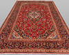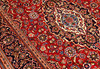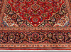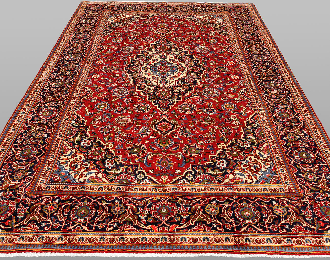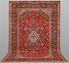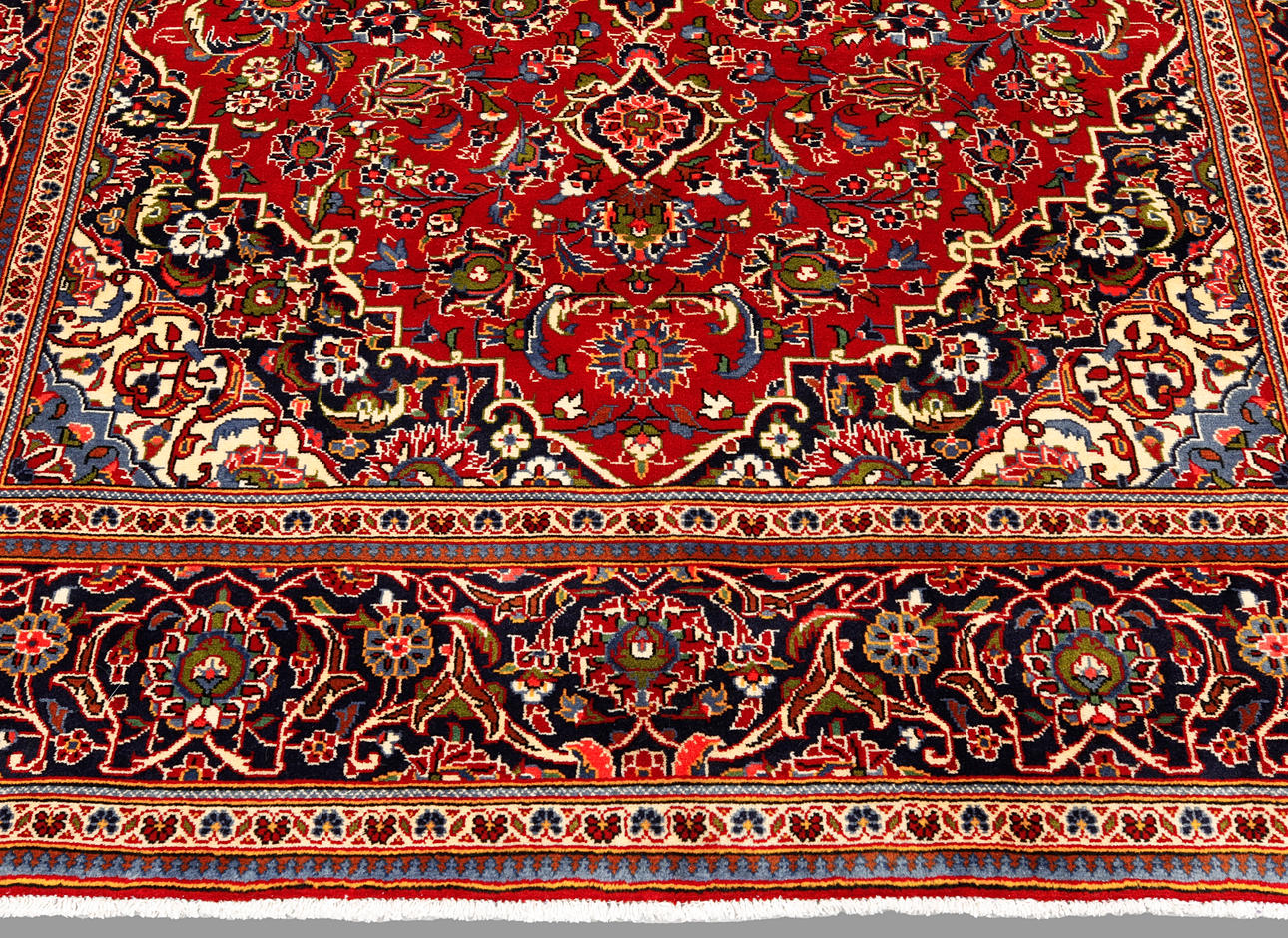 Keshan with a red base color and a centrally placed medallion in blue and beige as well as details in green and red. The center field is covered in floral ornamentation, palmettes and arabesques in similar shades, and the corner portions follow the same color scheme as the medallion. The border has a dark bottom and decor of palm branches. The forelock is made of wool and the warp is of cotton.