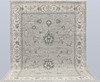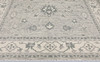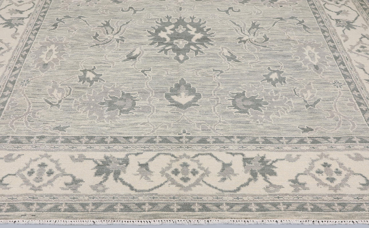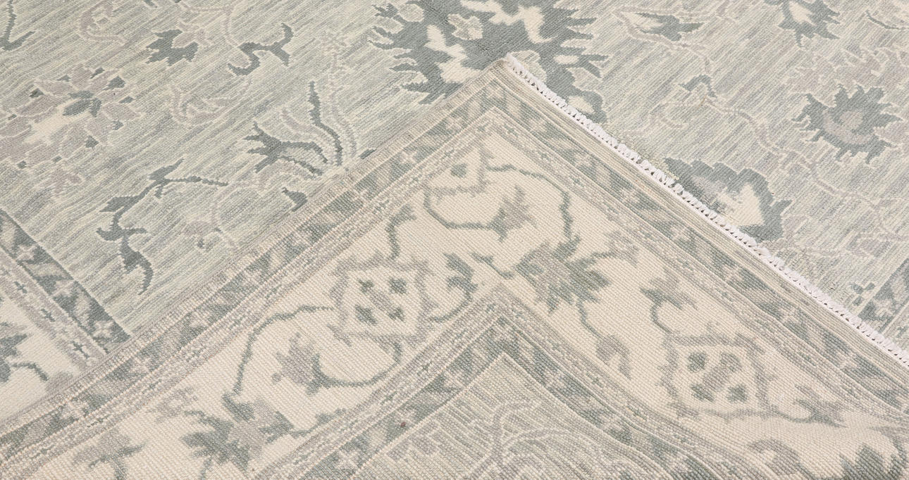 Zigler design with light gray bottom color and a center field covered in stylized plant motifs and palmettes in gray-green and beige. The border has light bottom with decor of stylized palmette cranes in similar shades. The forelock is made of wool and the warp is of cotton.