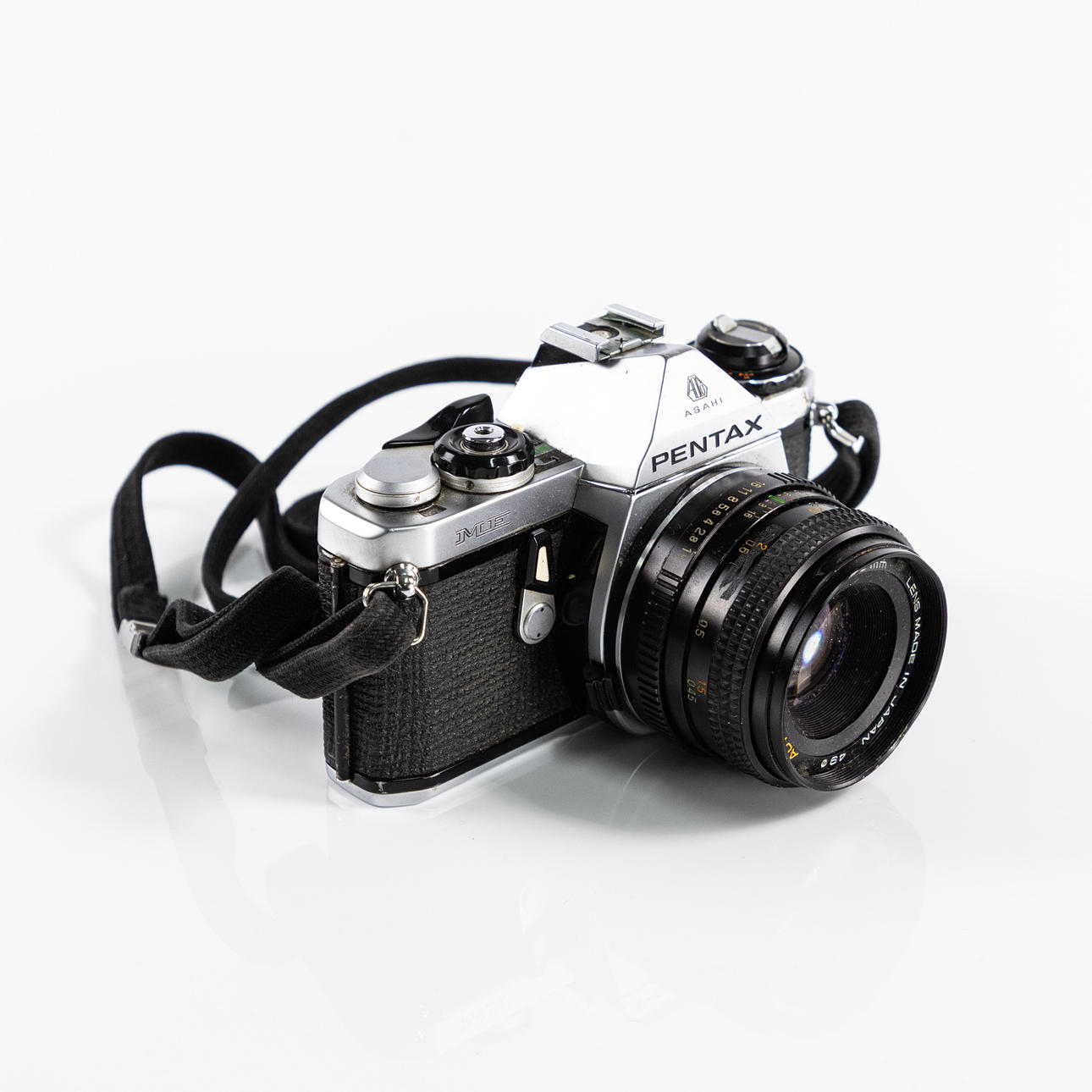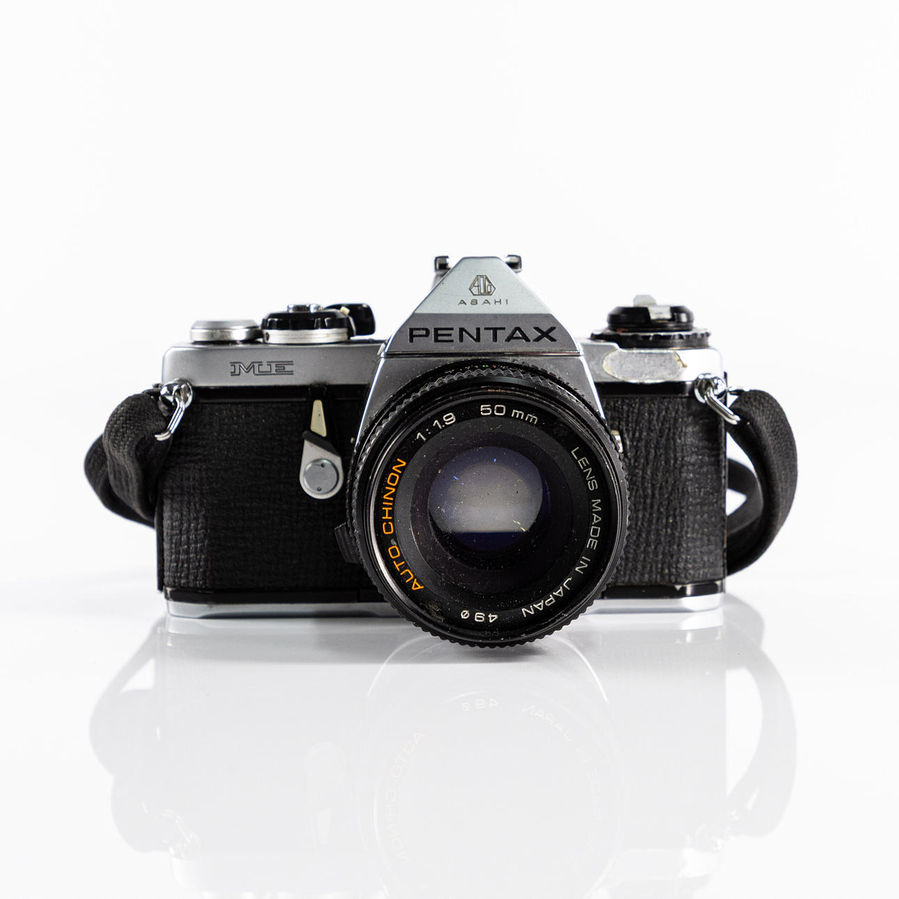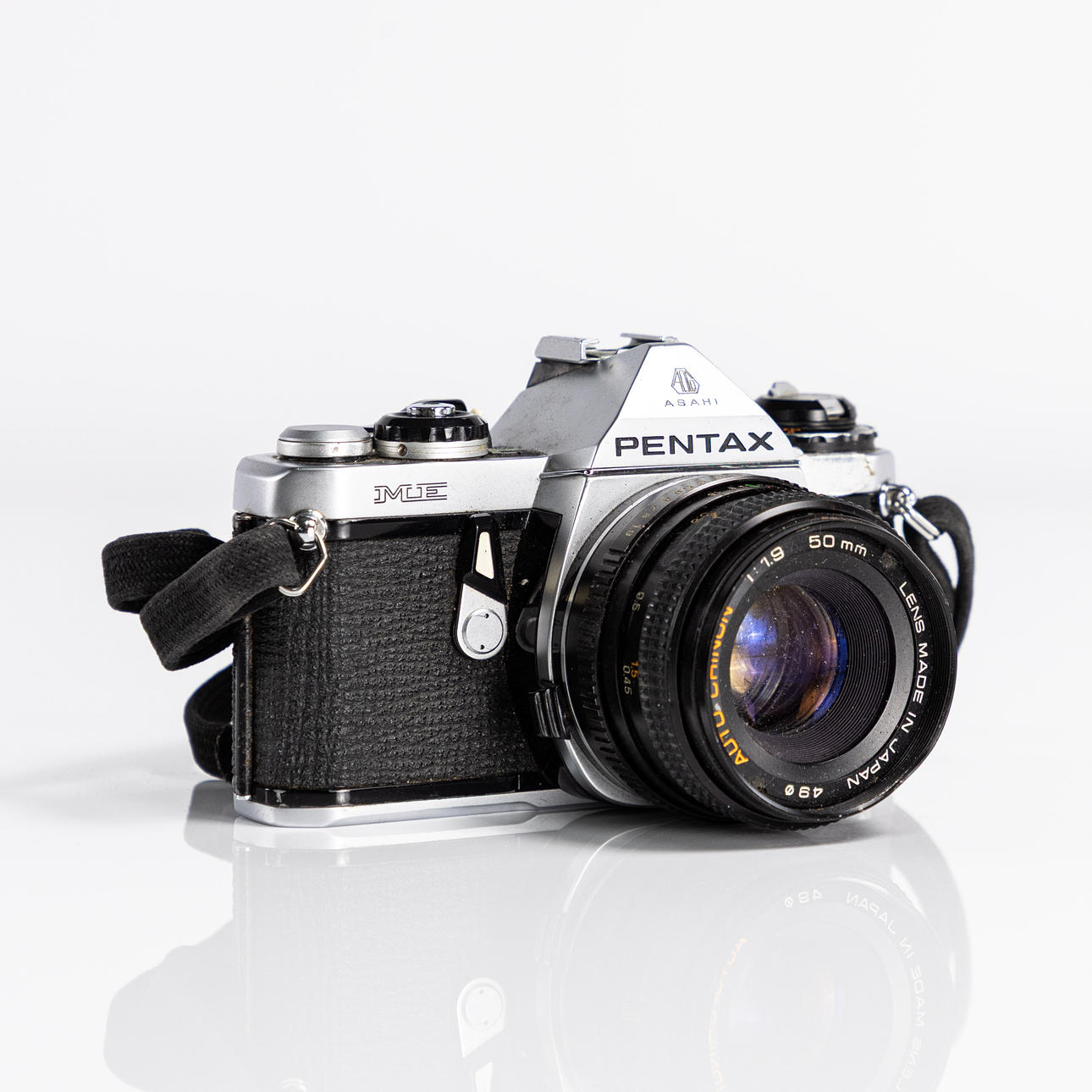 System camera, Pentax ME, Optics; Auto-Chinon 50 mm/ 1:1.9, circa 1970s, Japan. Accessories in the form of extender; Teleplus MC-7, flash; Sunpak auto124, light meter; Sekonic Flashmate. Comes with a modern camera bag.