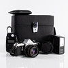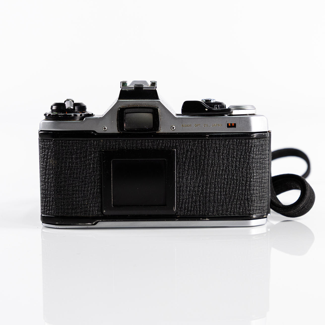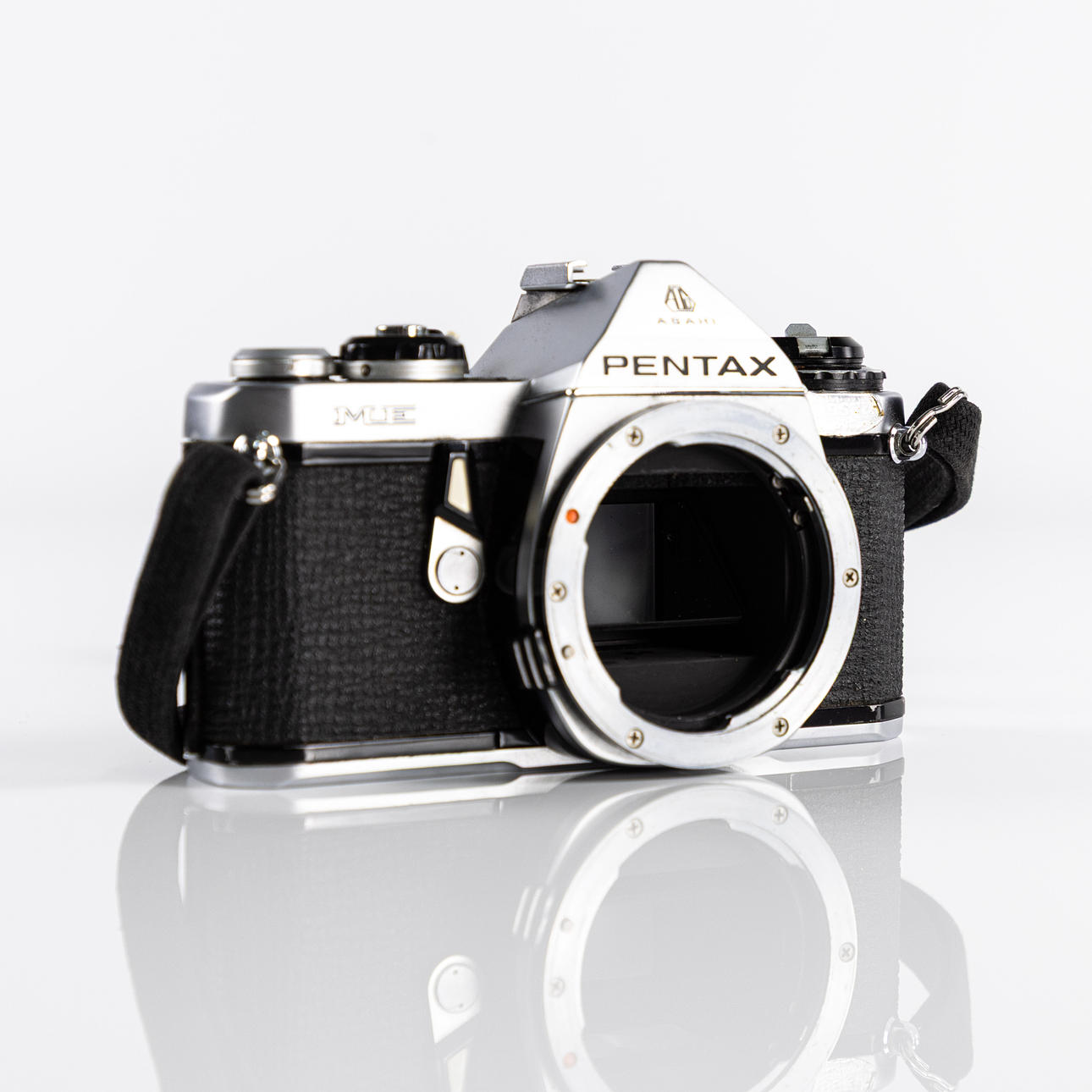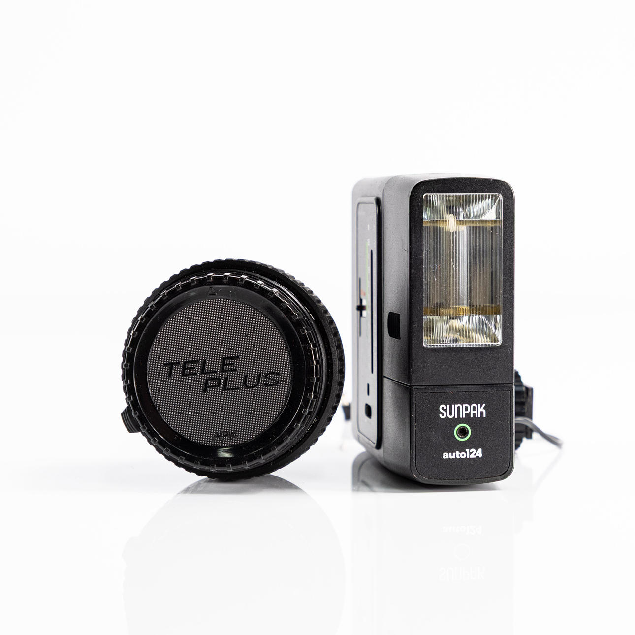 System camera, Pentax ME, Optics; Auto-Chinon 50 mm/ 1:1.9, circa 1970s, Japan. Accessories in the form of extender; Teleplus MC-7, flash; Sunpak auto124, light meter; Sekonic Flashmate. Comes with a modern camera bag.