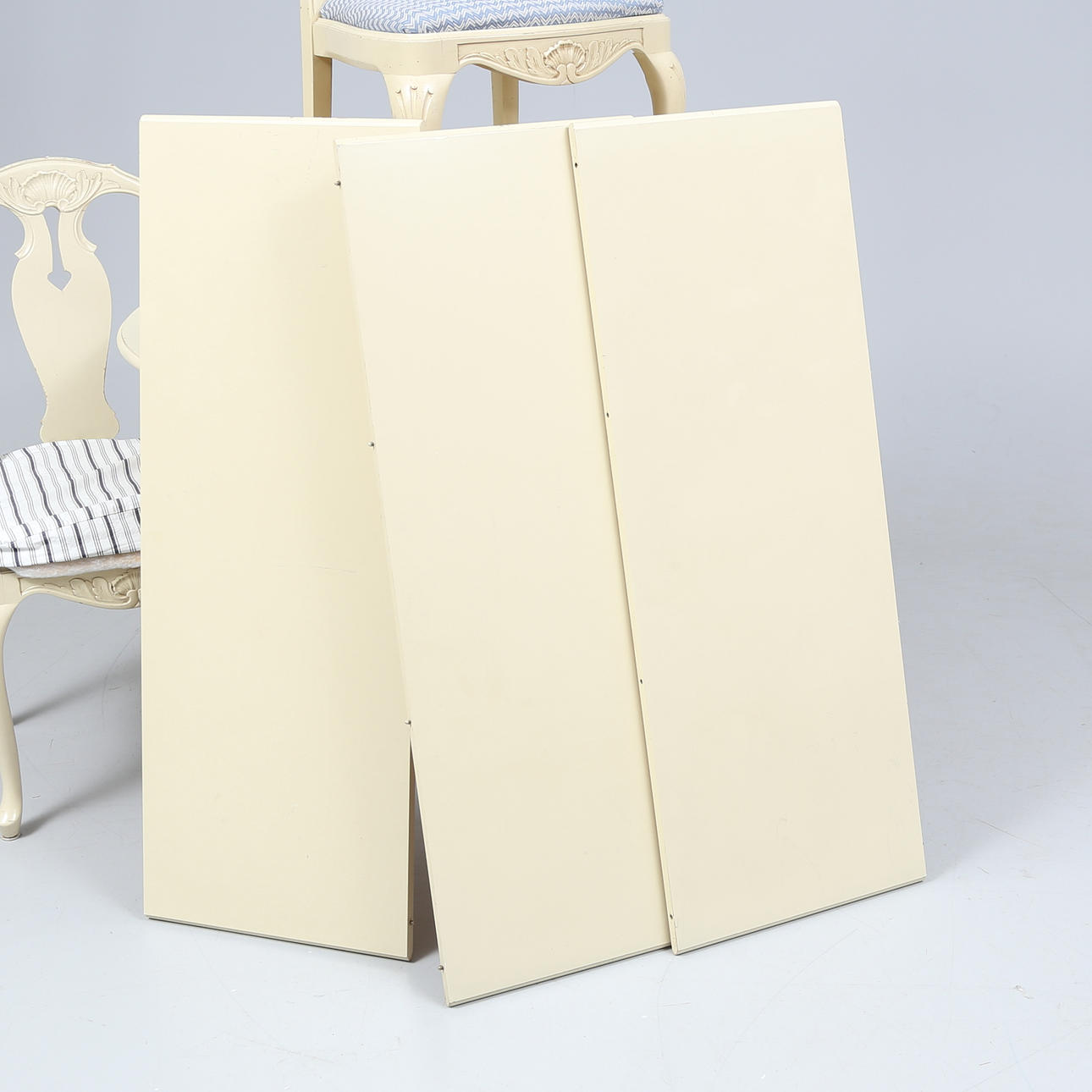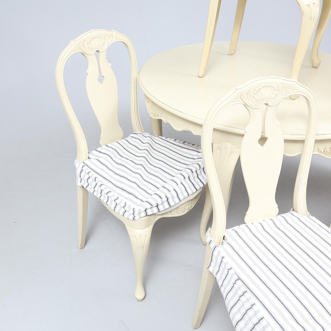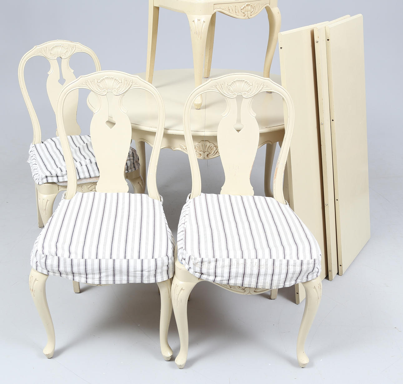 Table, height approx. 73 cm. Diameter about 110 cm. 4 chairs. 3 slices, width approx. 40 cm.