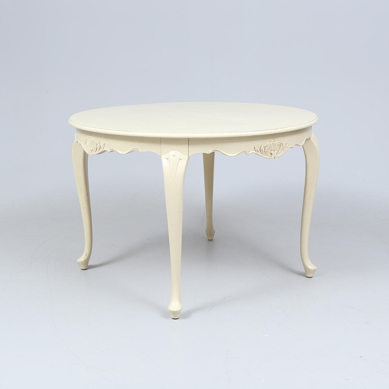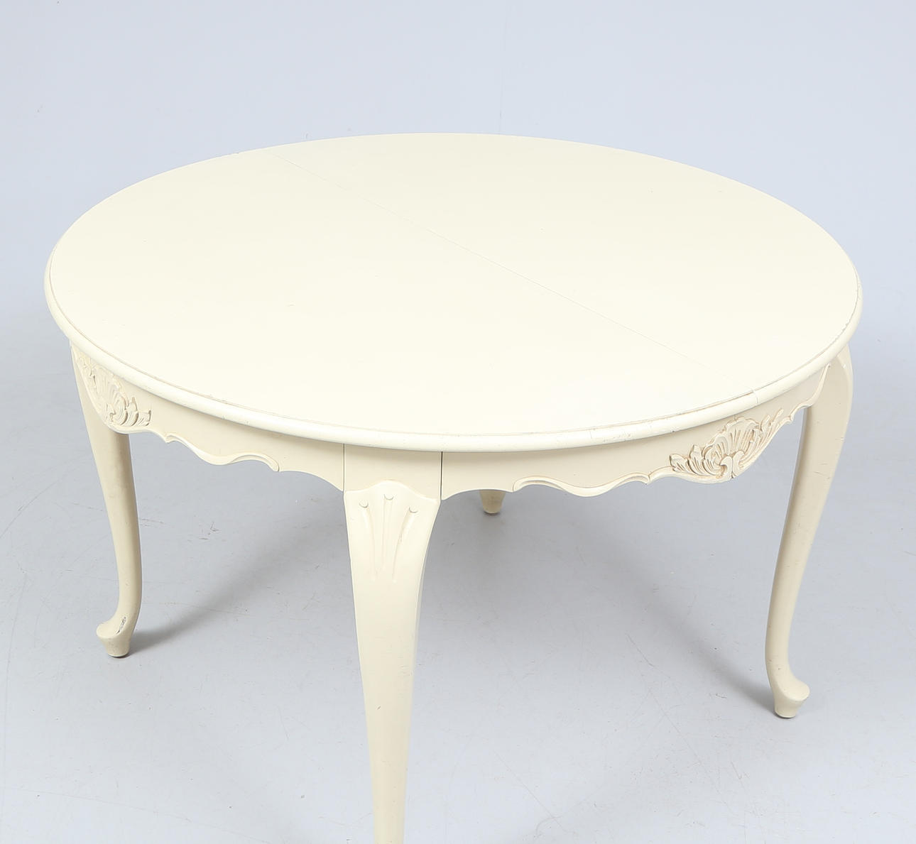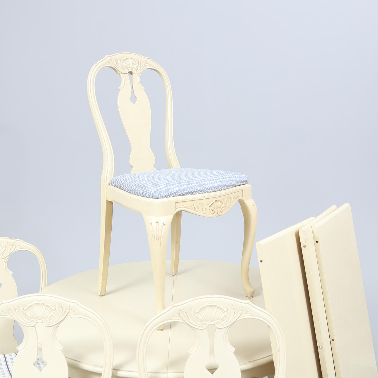Table, height approx. 73 cm. Diameter about 110 cm. 4 chairs. 3 slices, width approx. 40 cm.