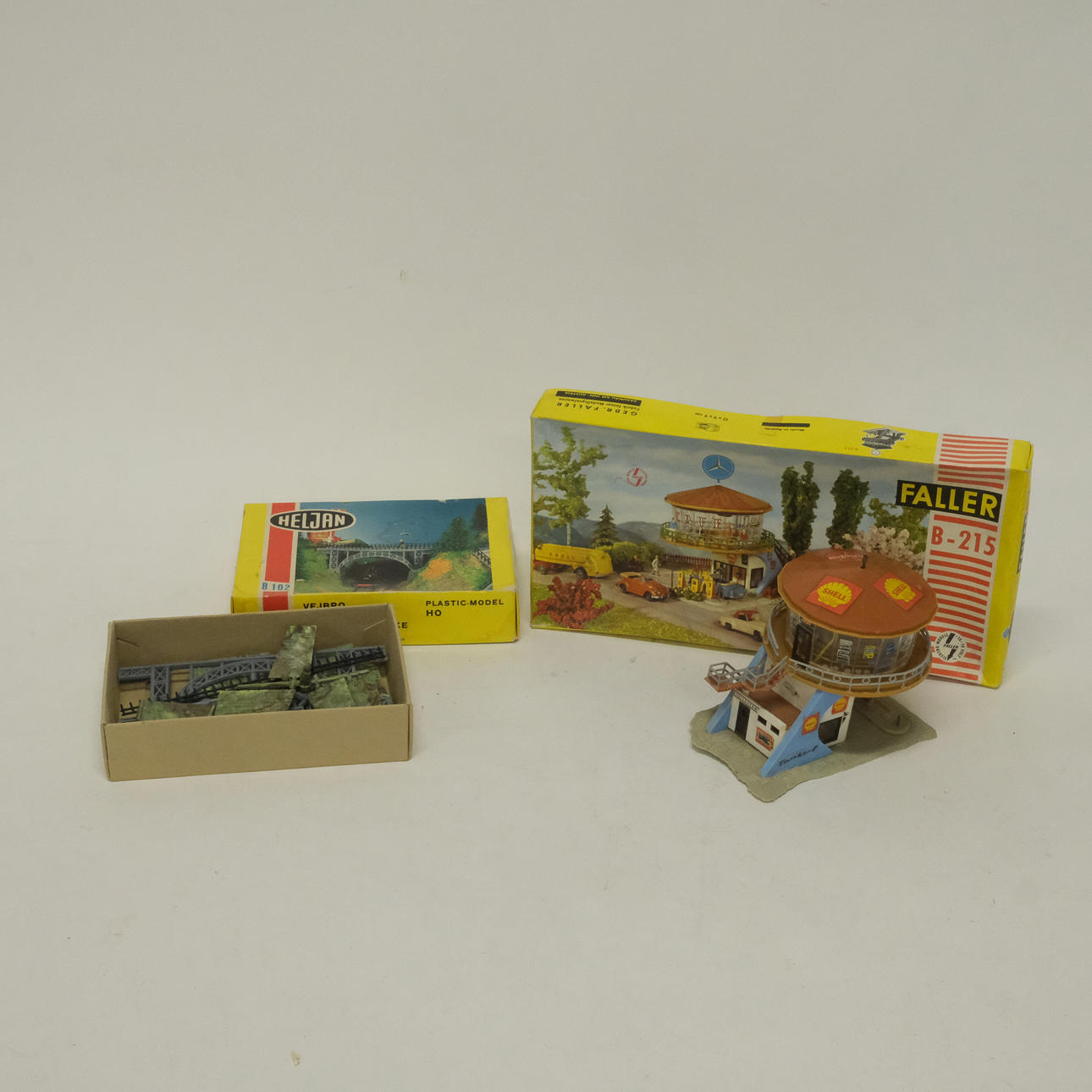 Heljan and Faller construction kits, some assembled buildings, accessories for buildings.