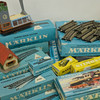 Märklin: tracks, level crossing, transformer, locomotive with tender, crane car, 6 carriages, arc lamps, station lamps, accessories, mostly in boxes.