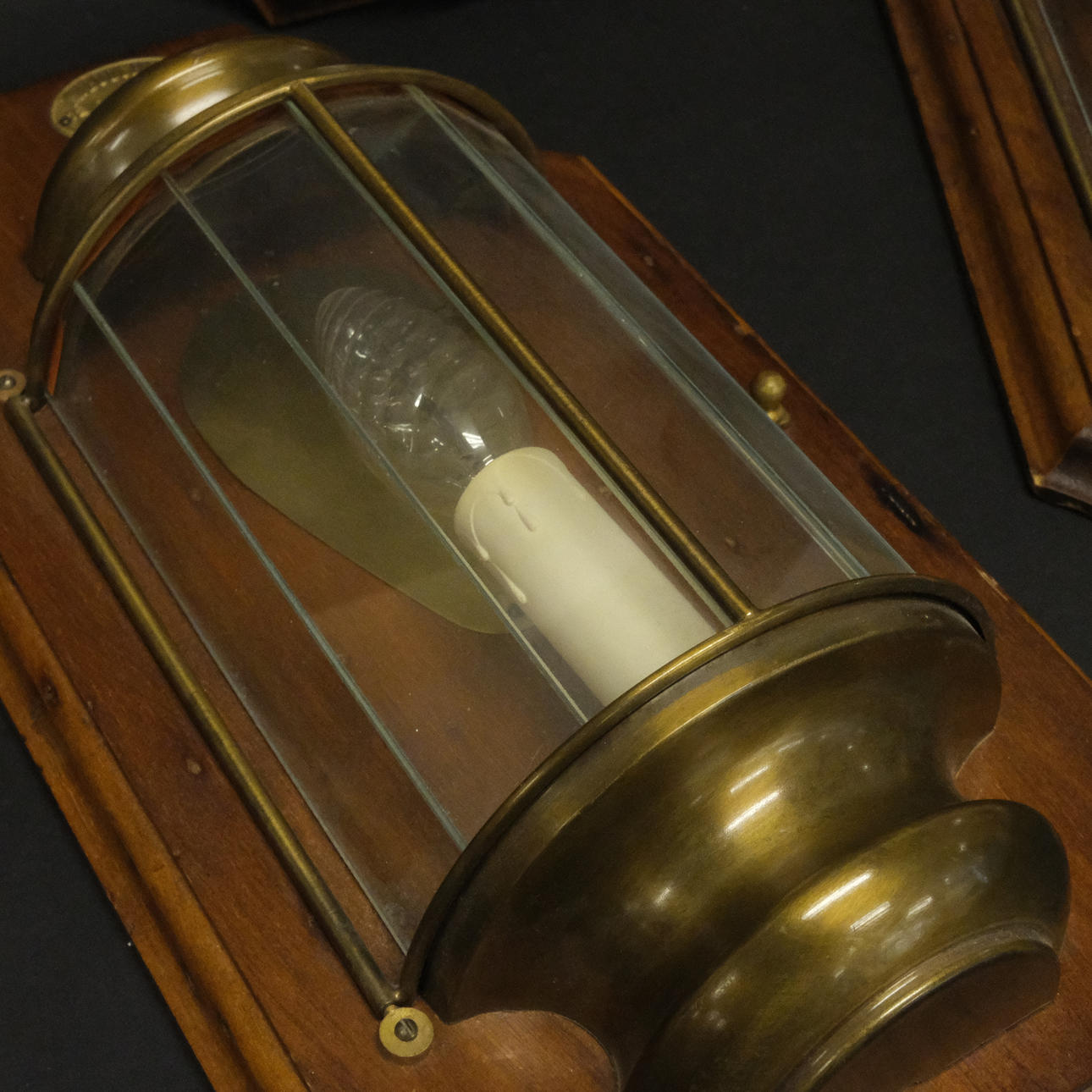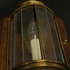 Nautical style, wooden backplate, glass and yellow metal details, one light point each, height approx. 40 cm, width 21 cm.