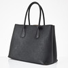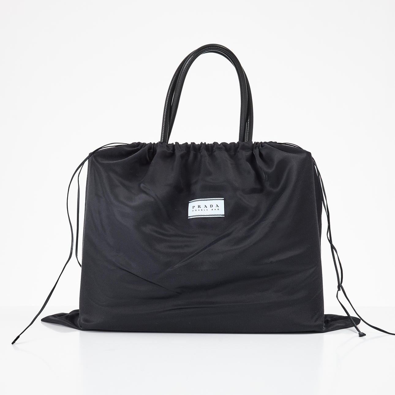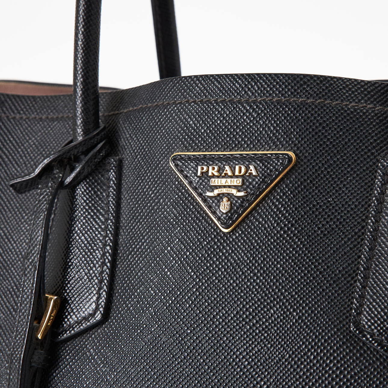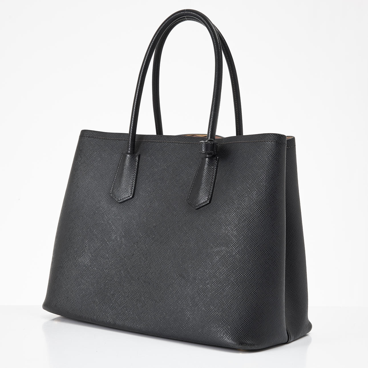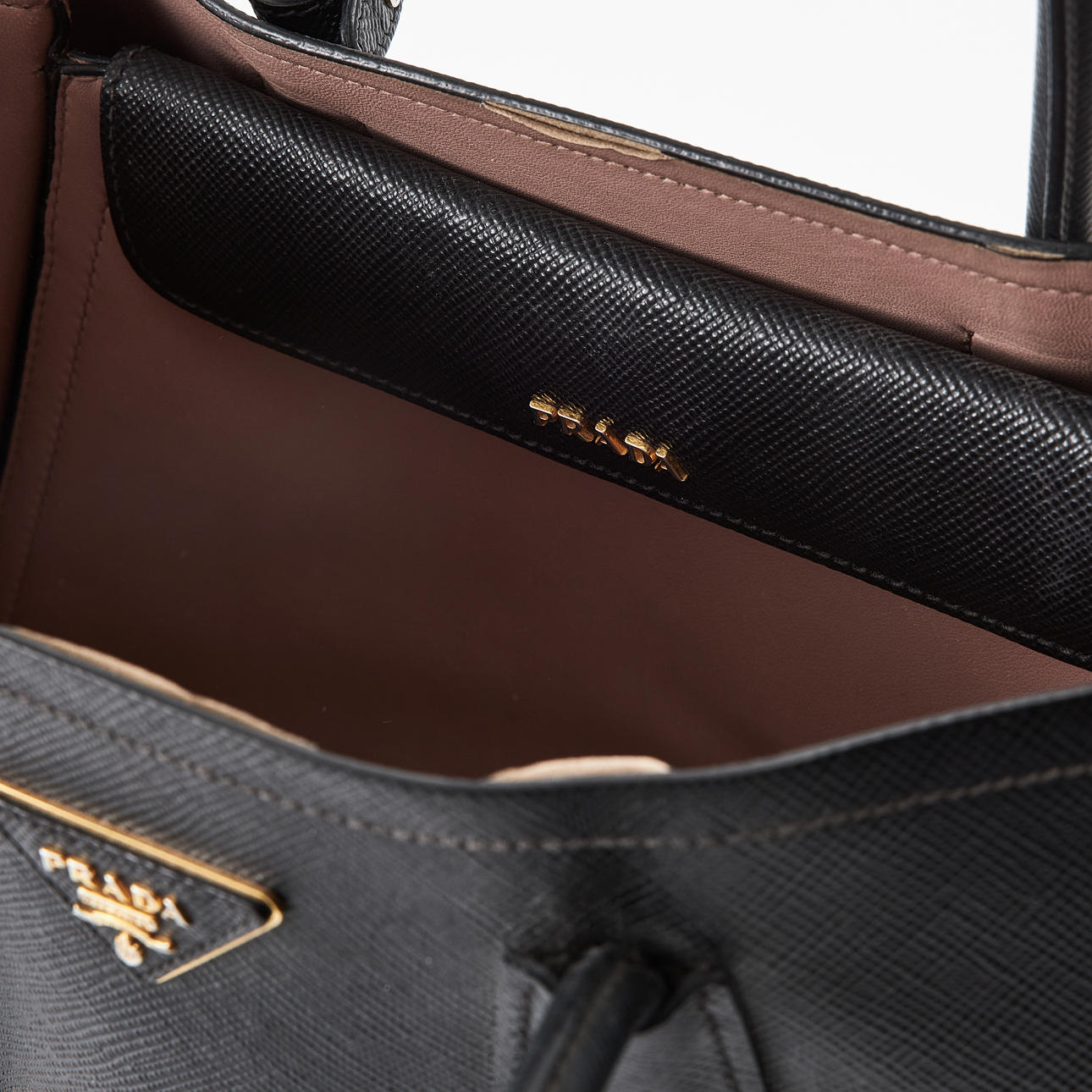 Black saffiano leather with gold-colored hardware and lined in light pink, double handles, inner tube folded into two large compartments separated by a smaller compartment with cover, rivets underneath, with address bar and removable crossbody strap, marked “Prada Milano”, dimensions approx. 37 x 28 x 18 cm.