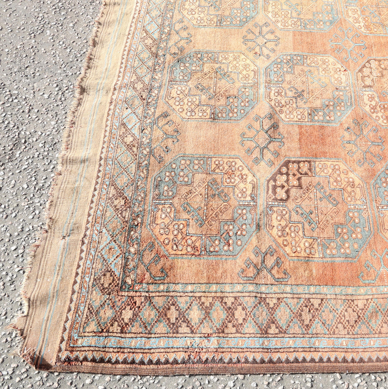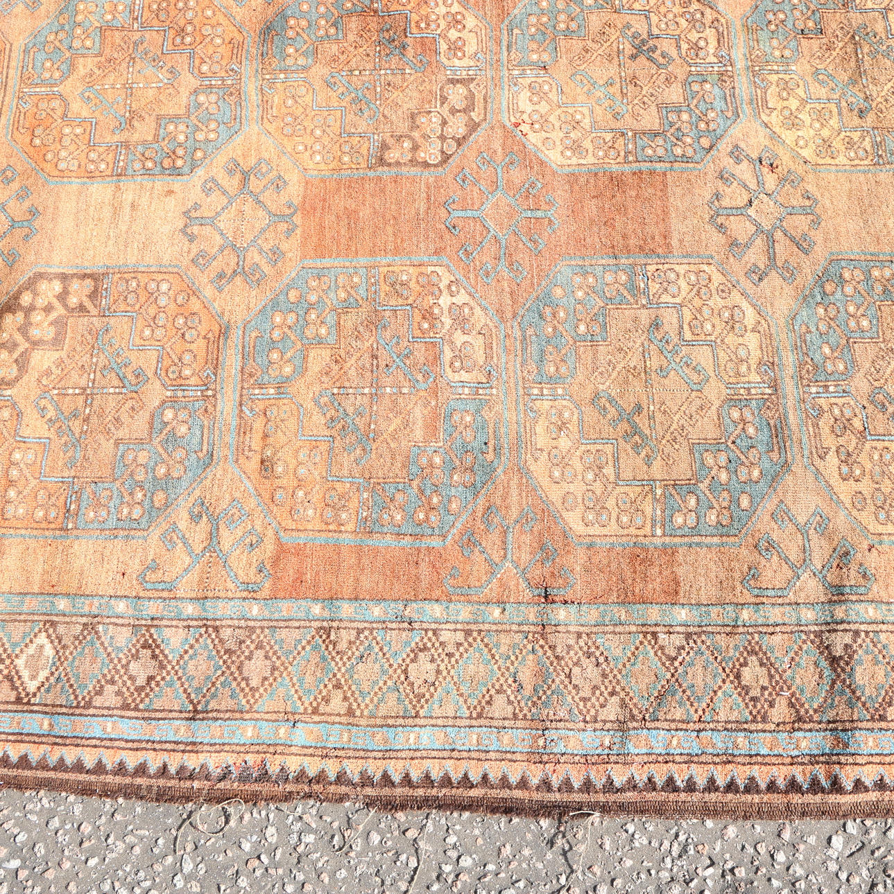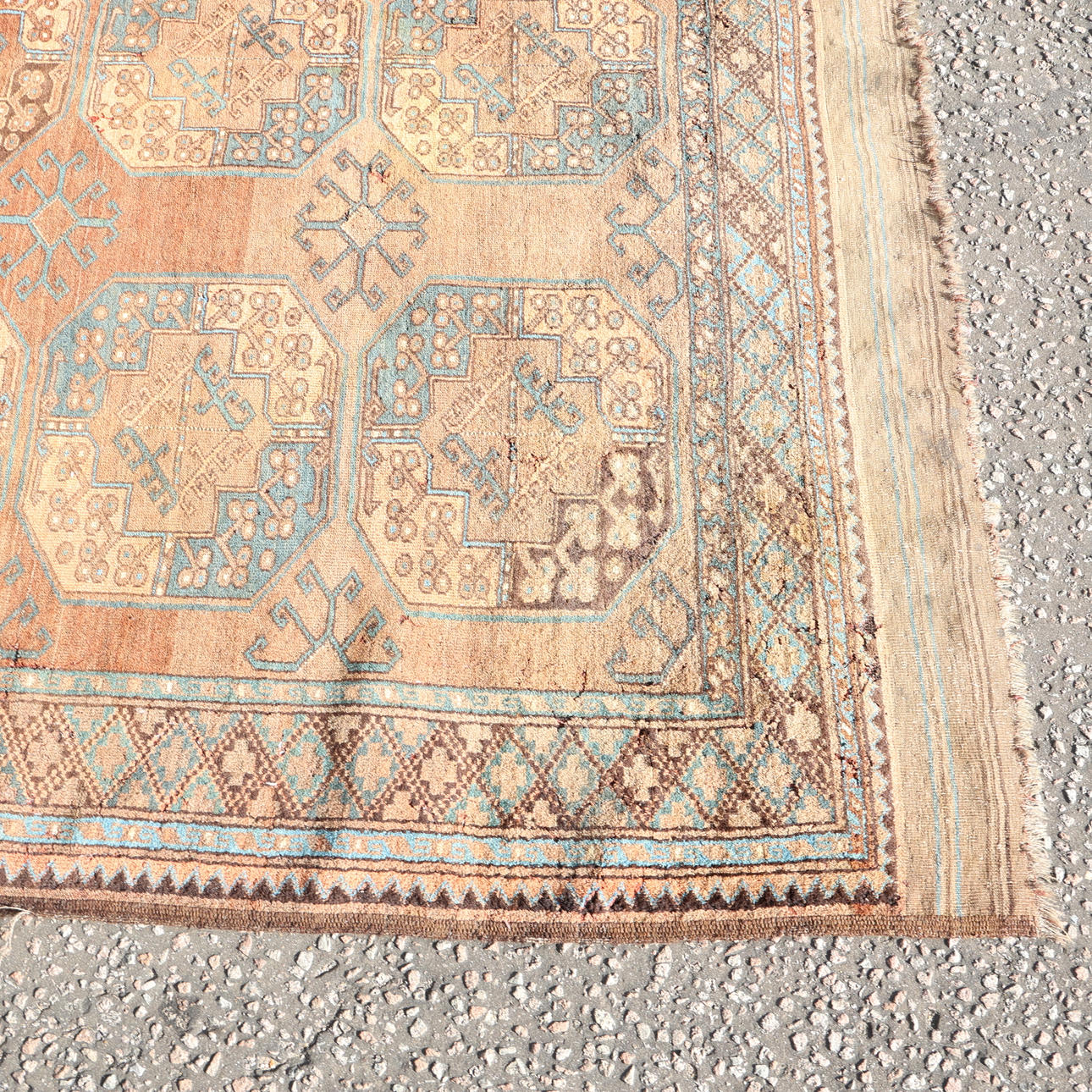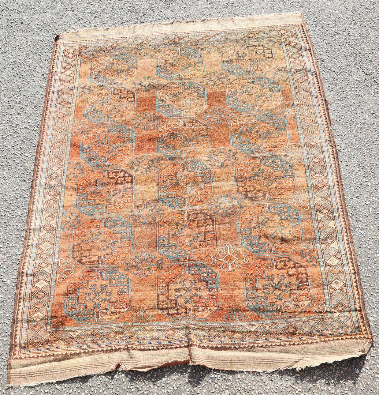 The faded and abrashed madder field with 3 rows of octagonal guls interspersed with hooked secondary guls, within a lattice and cruciform border, boteh, hooked, and tooth guards, wide kelim at both ends, 300 x 219cm overall approx.