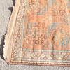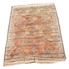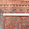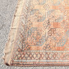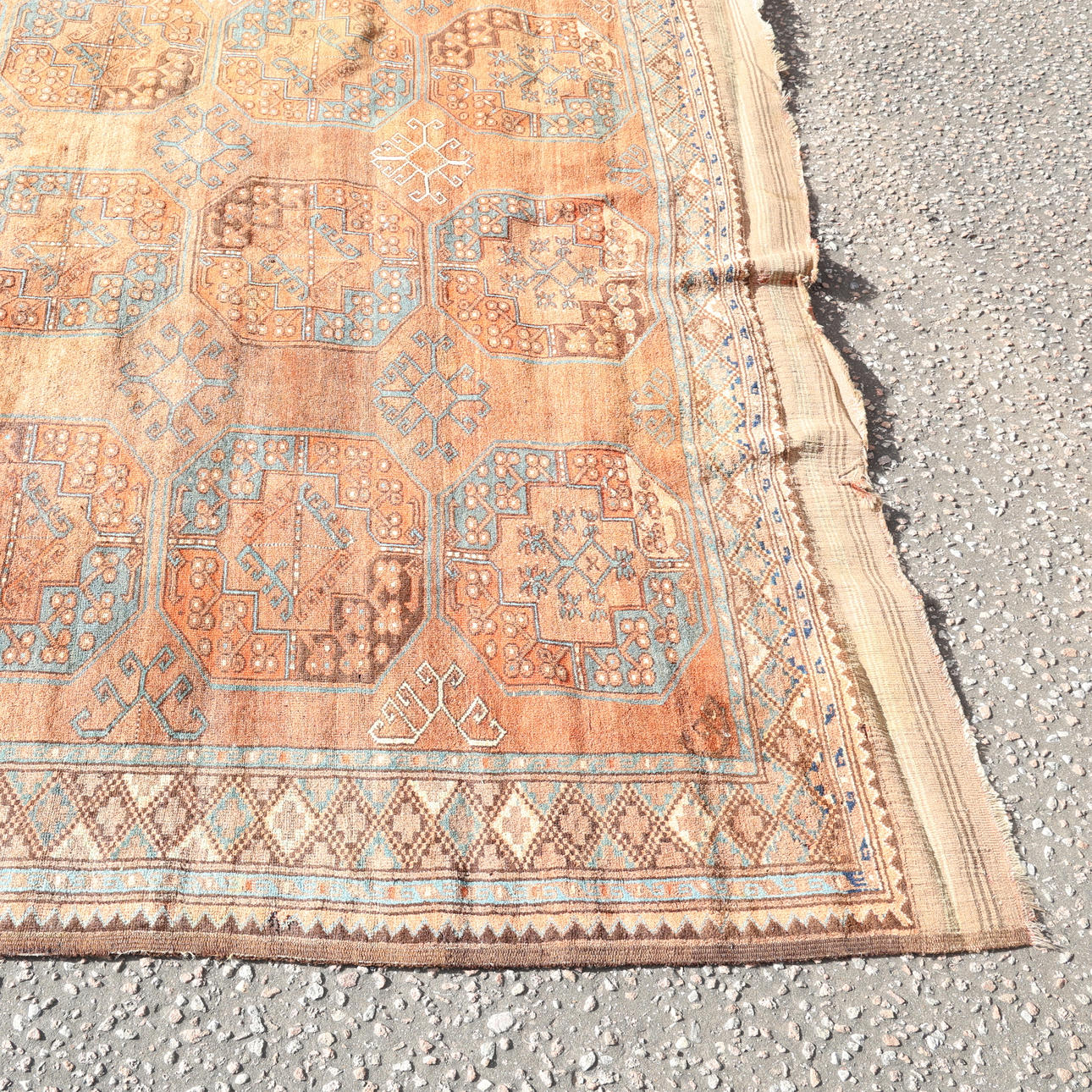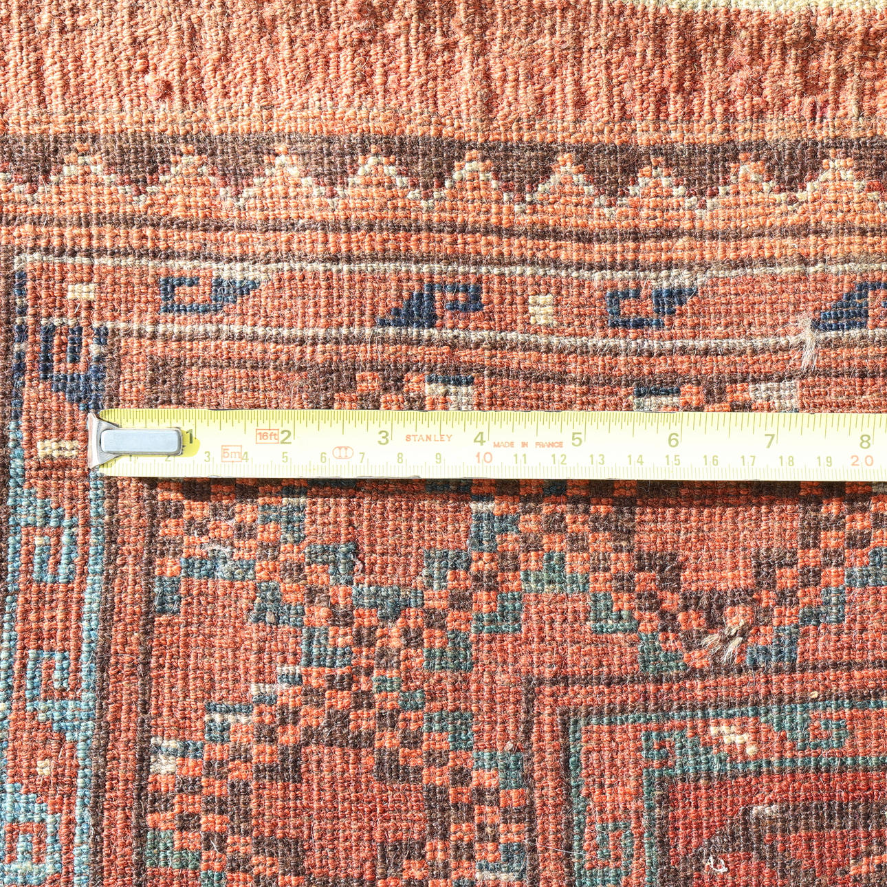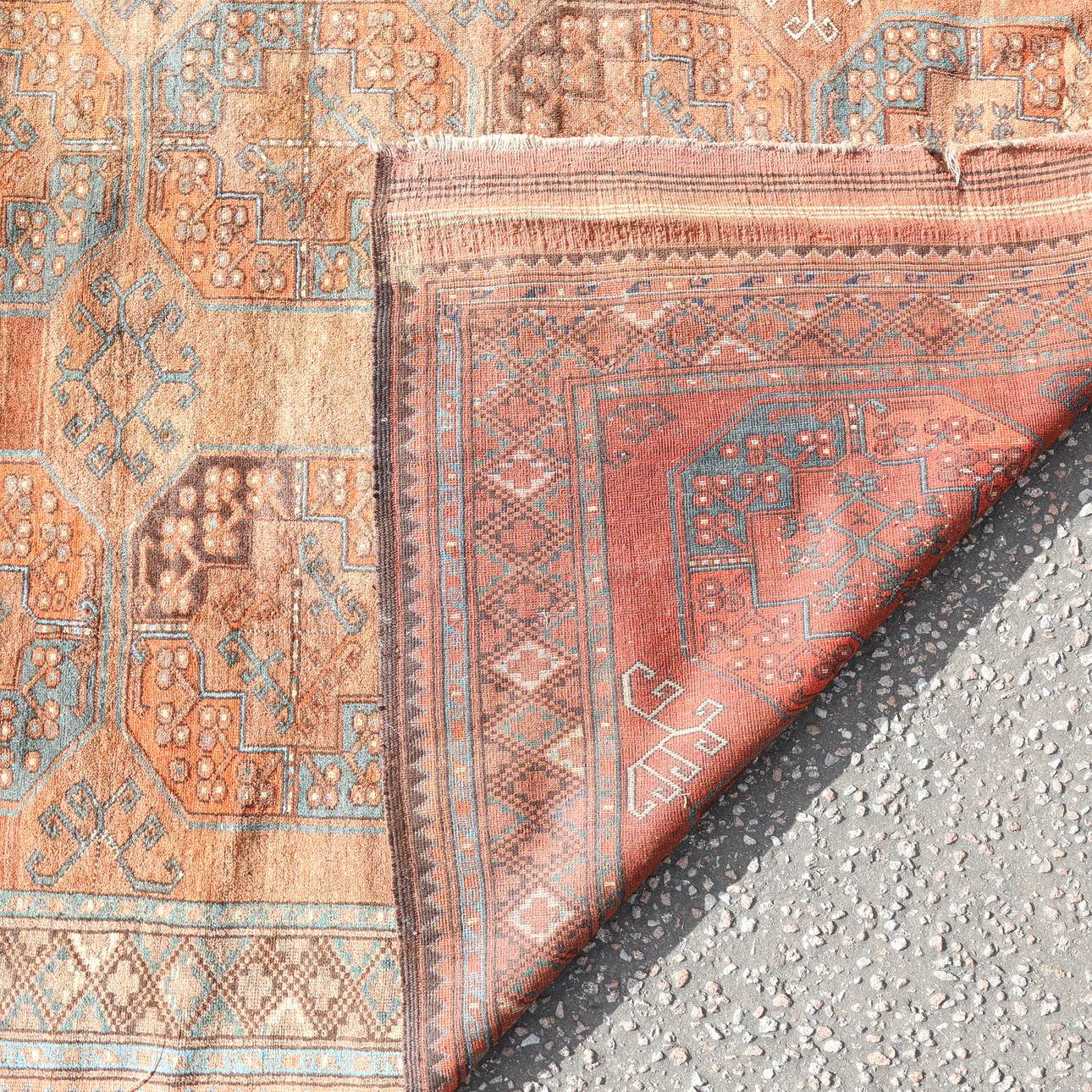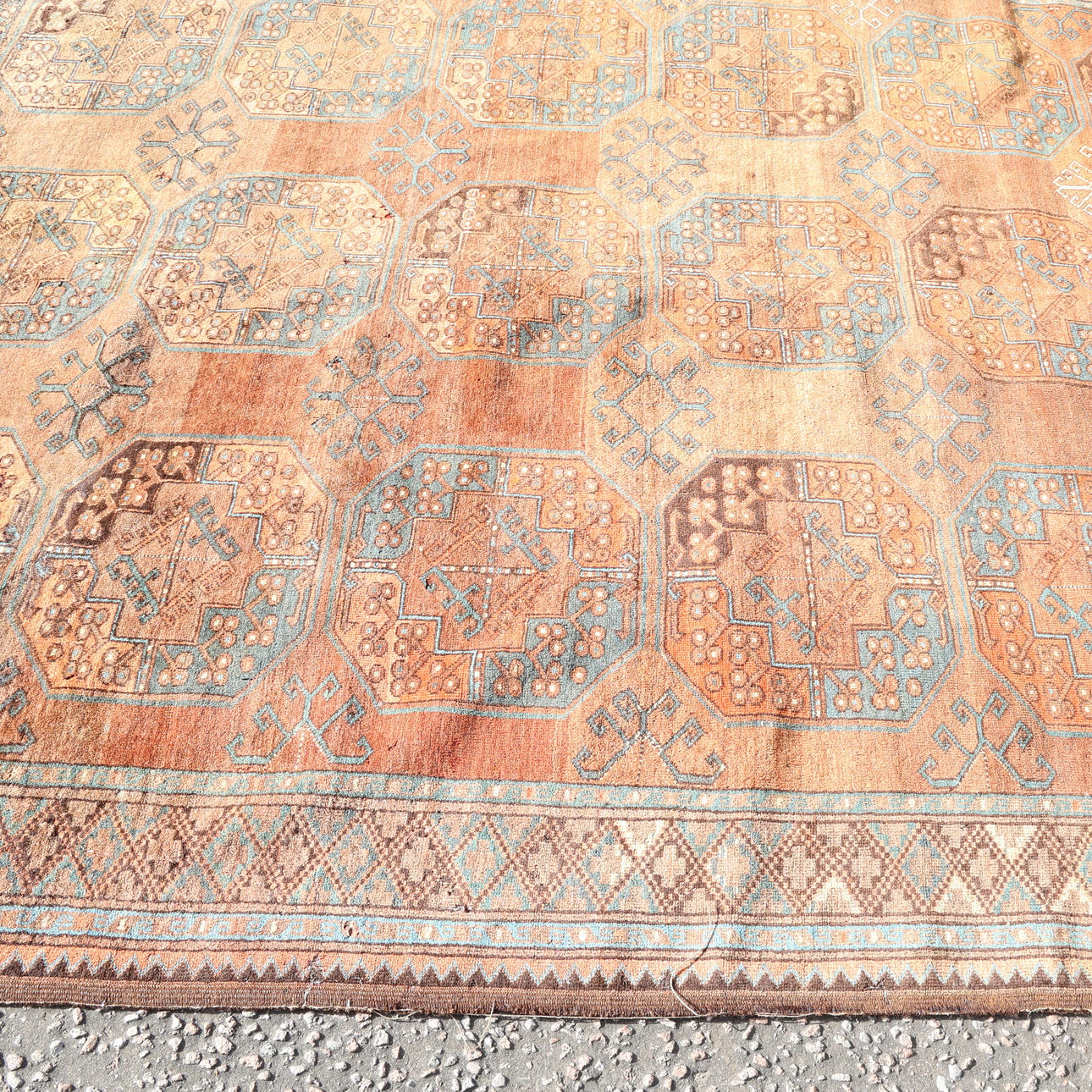 The faded and abrashed madder field with 3 rows of octagonal guls interspersed with hooked secondary guls, within a lattice and cruciform border, boteh, hooked, and tooth guards, wide kelim at both ends, 300 x 219cm overall approx.