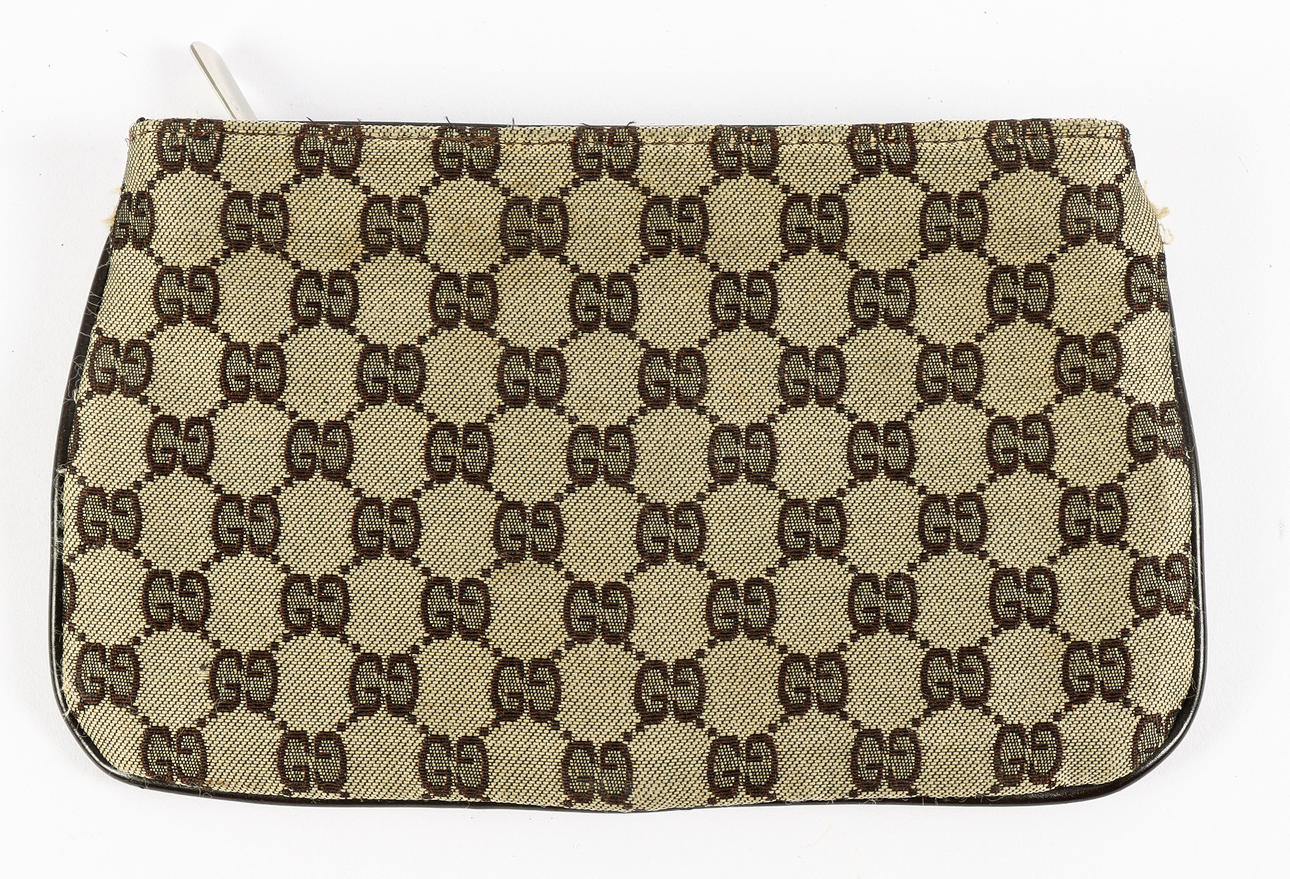 Monogram canvas with details in white metal and brown leather. Interior with suede. Tagged “GUCCI MADE IN ITALY”.