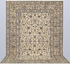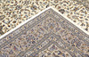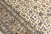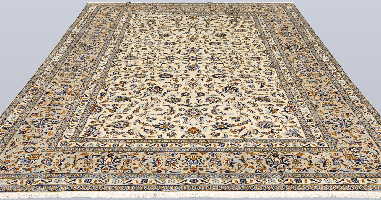 Keshan with bright bottom color and a center field covered with floral ornaments, palmettes and arabesques in blue, beige and red details. The border has a bright bottom and decor of palm branches. The forelock is made of wool and the warp is of cotton.