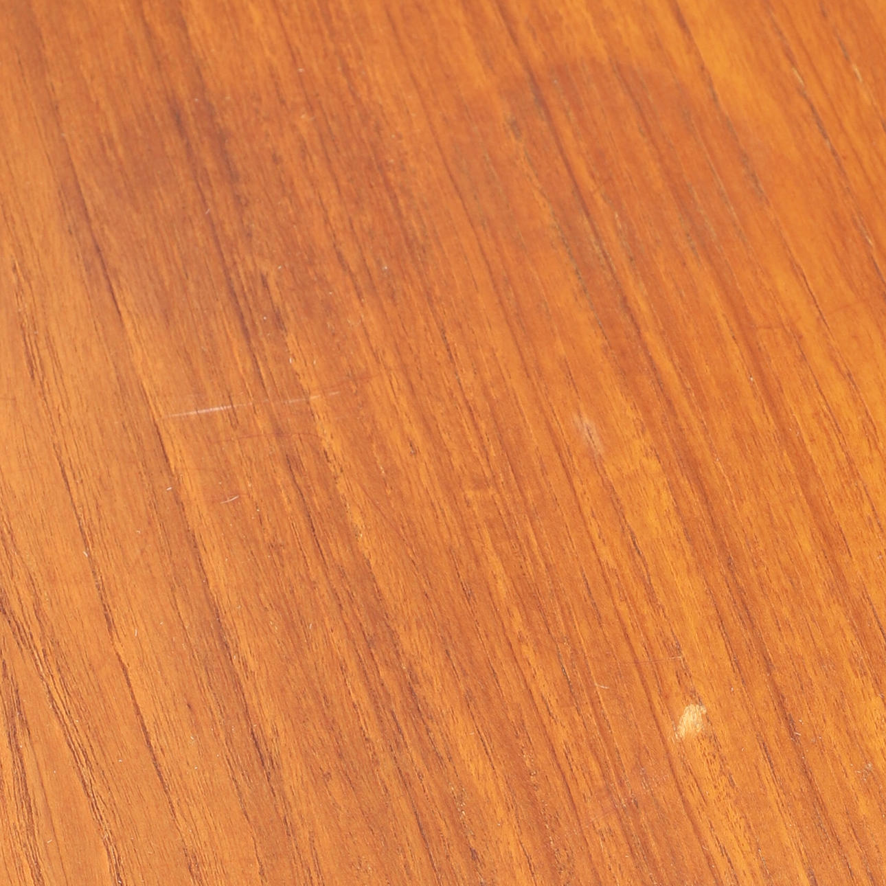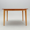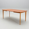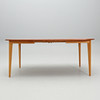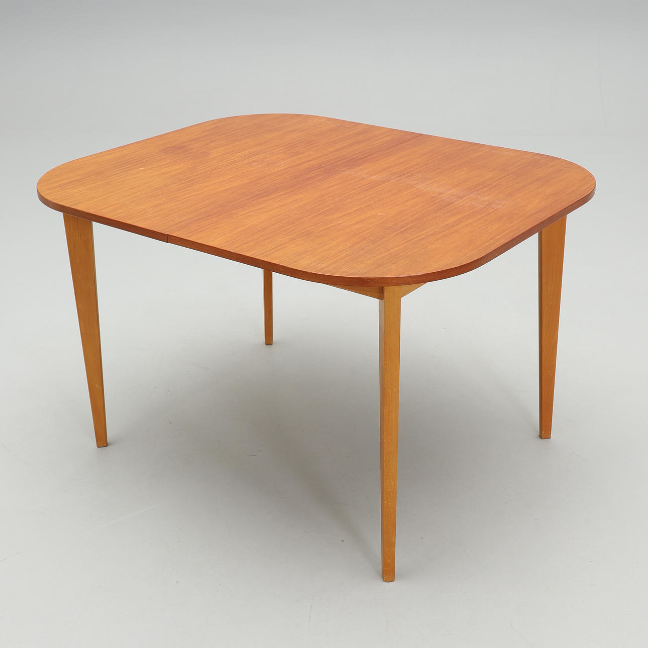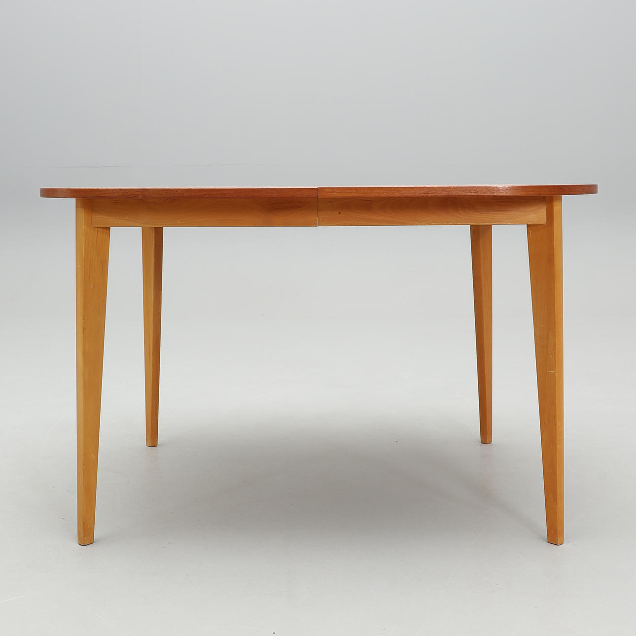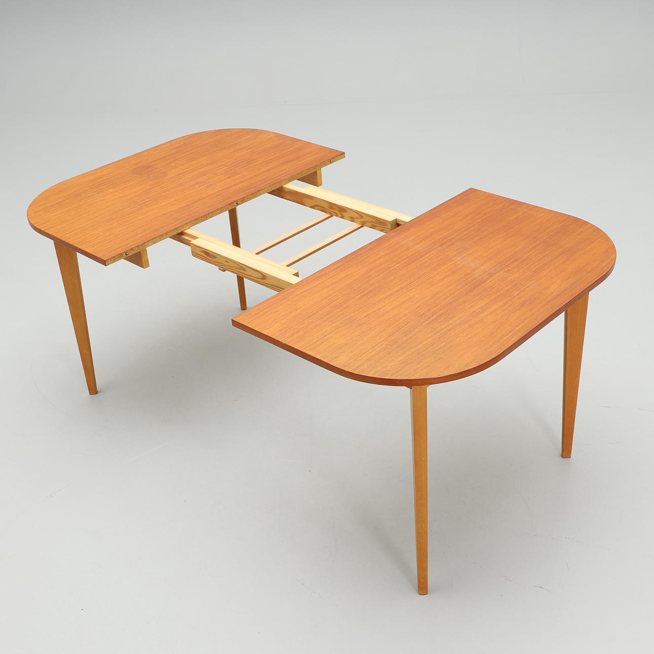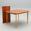 Disc veneered with teak. Bones of book. Two insert plates of 30 cm. Length 120 (with insert plates 180), width 99, height 73.5 cm.