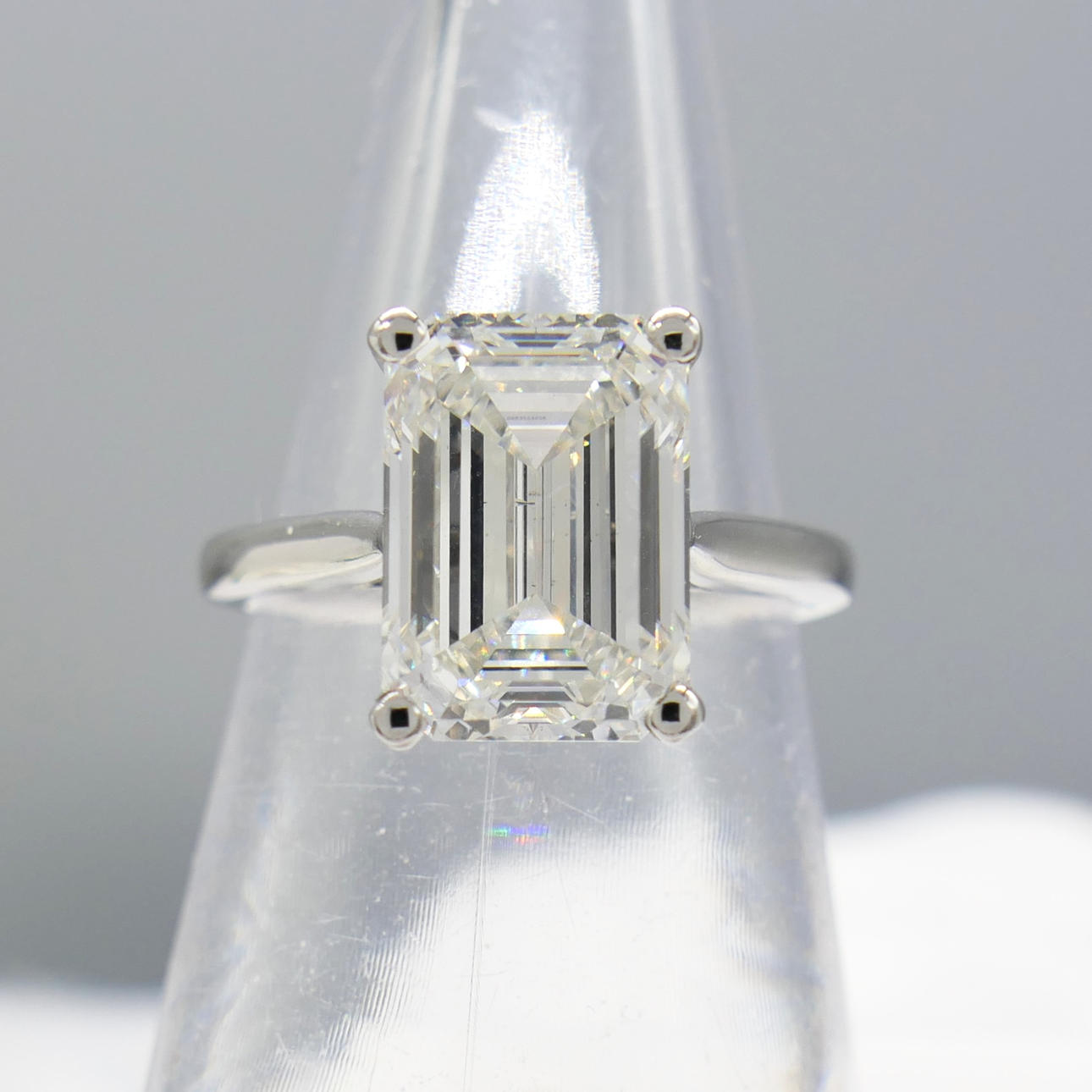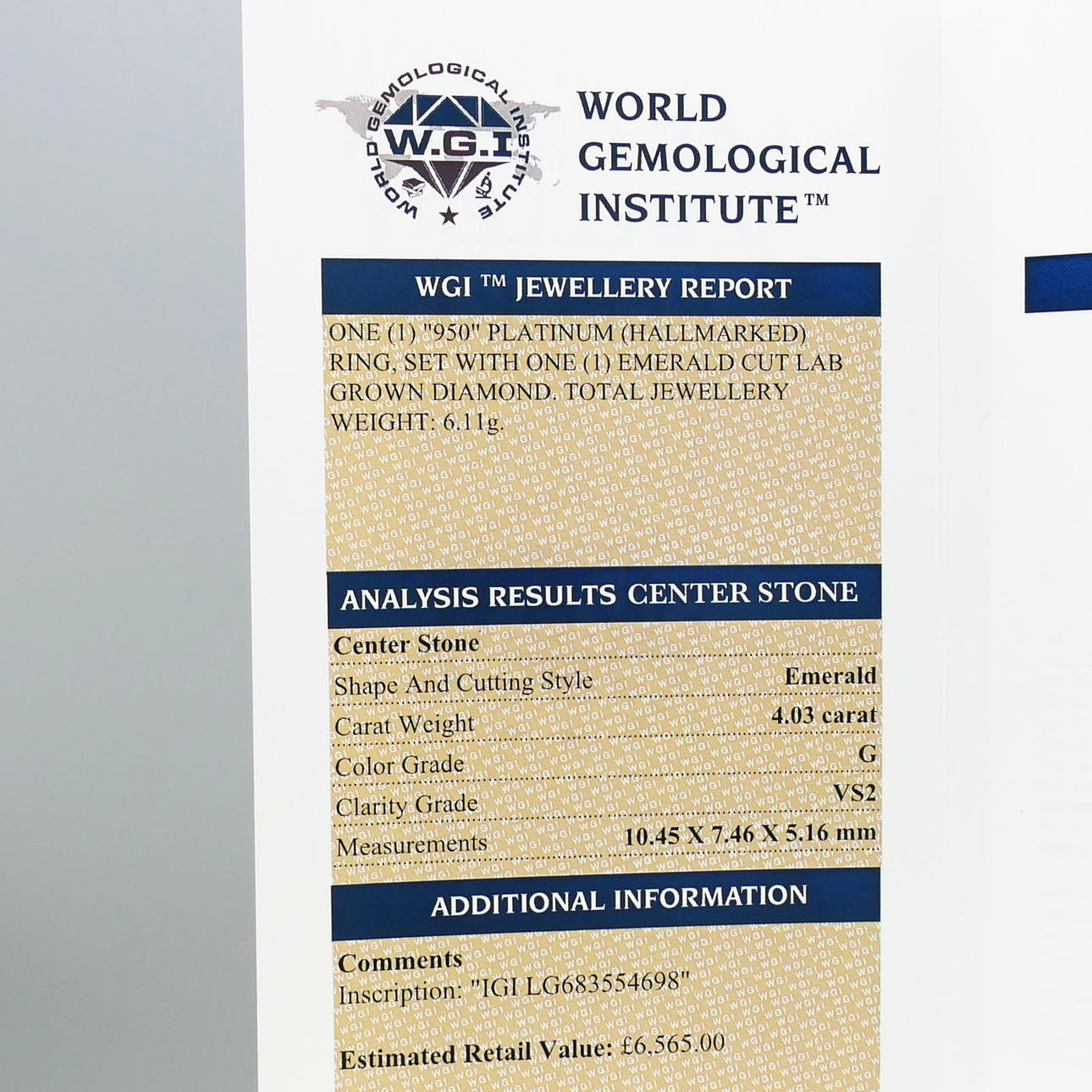 A 950 platinum solitaire ring set with a single lab grown diamond weighing 4.03 carats. Supplied with certificate and gift box
